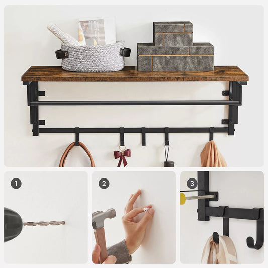 In And OutdoorMatch Wandgarderobe Connor – mit Ablage – Wandregal – mit 5 abnehmbaren Haken – Hängeregal – Wandmontage – Kleiderstange – für Flur – Schlafzimmer – Badezimmer – Vintage-Braun/Schwarz