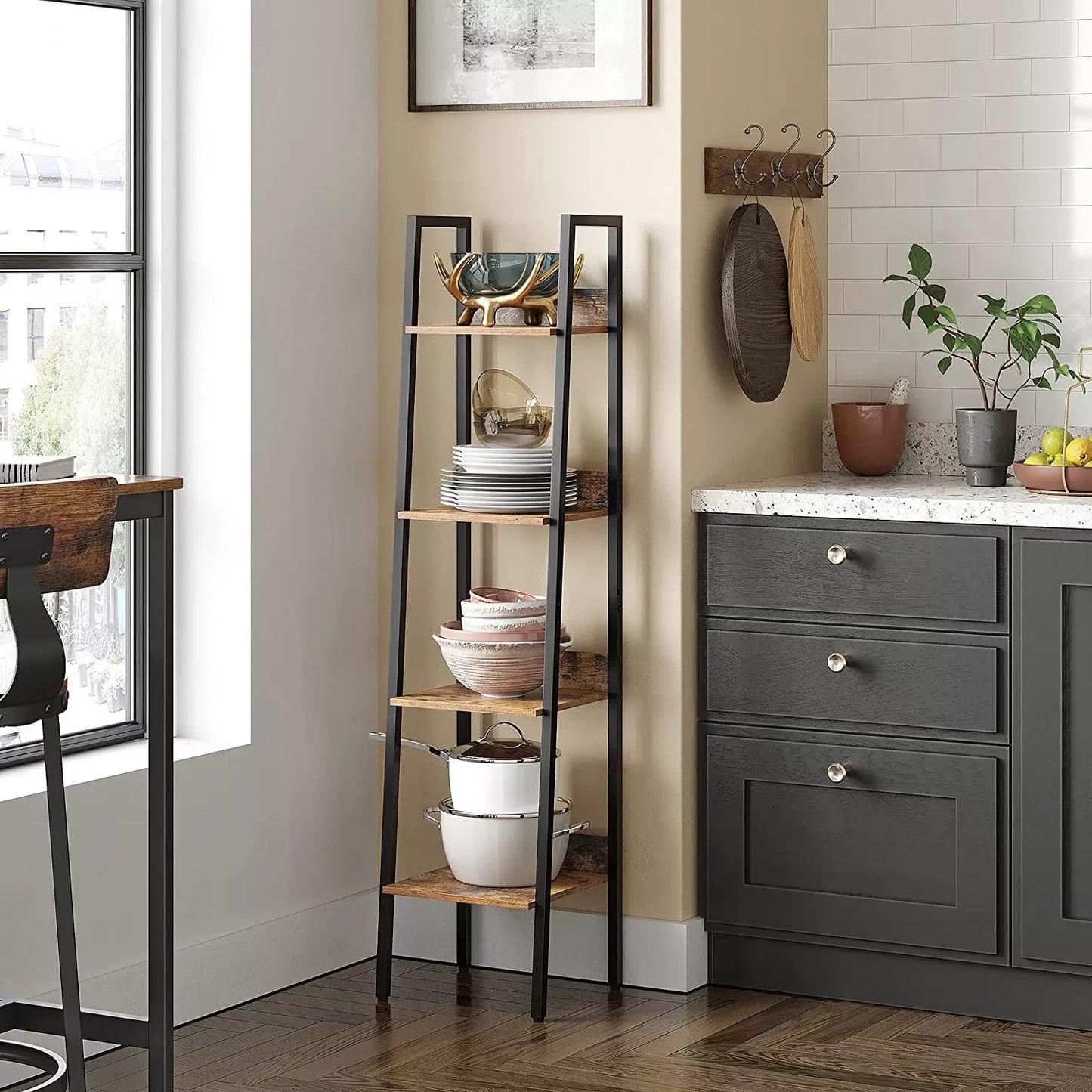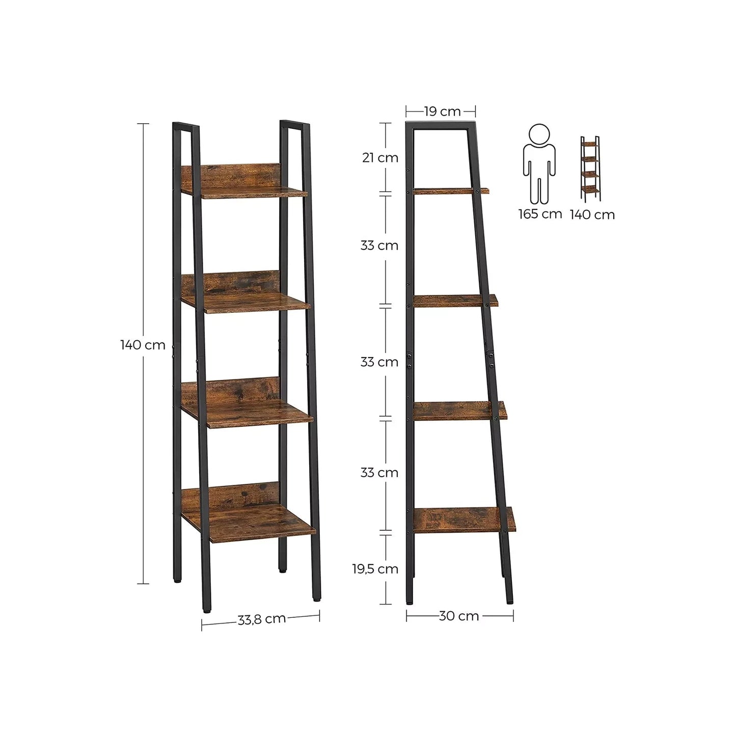 Produktdetails: – Farbe: Vintage-Braun-Schwarz – Material: Spanplatte, Stahl – Maße: 33,8 x 30 x 140 cm (L x B x H) – Gewicht: 6 kg – max. Statische Belastung pro Regalebene: 10 kg Lieferumfang: - 1 x Leiterregal - 1 x Zubehörpaket - 2 x Kippschutz - 1 x AnleitungInand Outdoormatch Hinweise: - Befestigen Sie dieses Produkt mit dem mitgelieferten Kippschutz an der Wand. Aus Sicherheitsgründen ist es Kindern nicht gestattet, auf das Produkt zu klettern oder damit zu spielen.