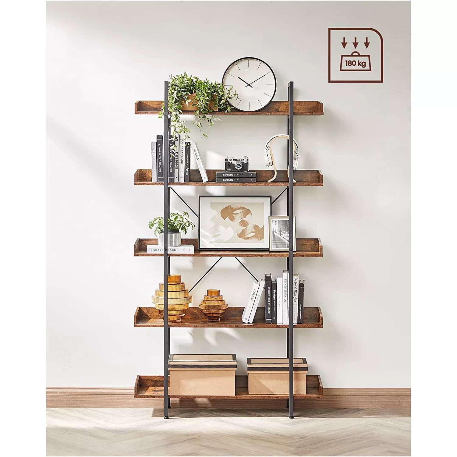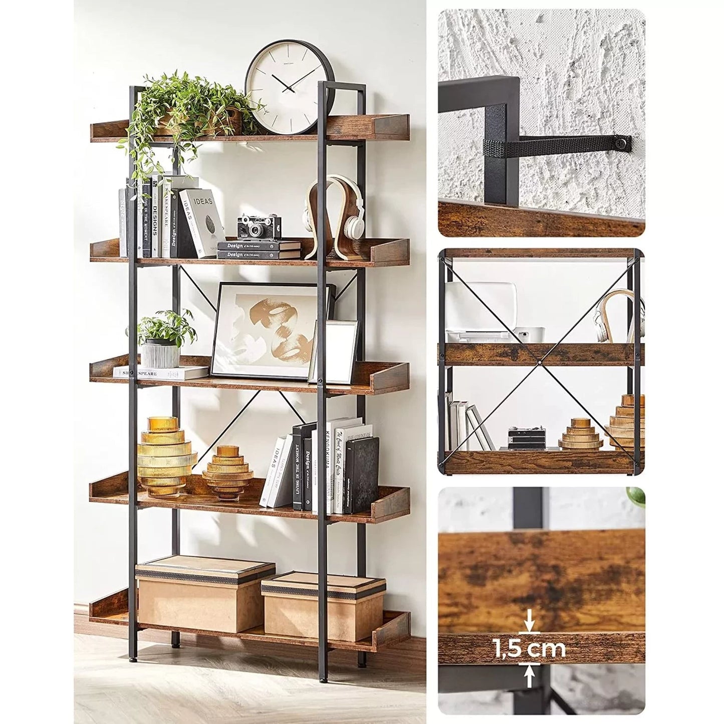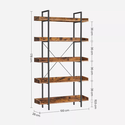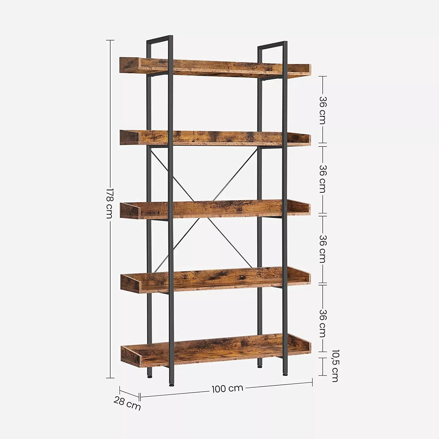 Produktdetails: – Farbe: Vintage-Braun-Schwarz – Material: Spanplatte, Stahl – Maße: 100 x 28 x 178 cm (L x B x H) – Abstand zwischen den Regalen: 36 cm – Gewicht: 19,7 kg – max. statische Belastbarkeit pro Regalebene: 36 kg - max. Gesamte statische Belastung: 180 kg Lieferumfang: - 1 x Bücherregal - 1 x Zubehörpaket - 1 x Kippschutzstütze - 1 x Bedienungsanleitung Inand Outdoormatch Hinweise: - Aus Sicherheitsgründen sollten Kinder nicht darauf klettern oder damit spielen. Befestigen Sie dieses Produkt mit dem mitgelieferten Kippschutz an der Wand.