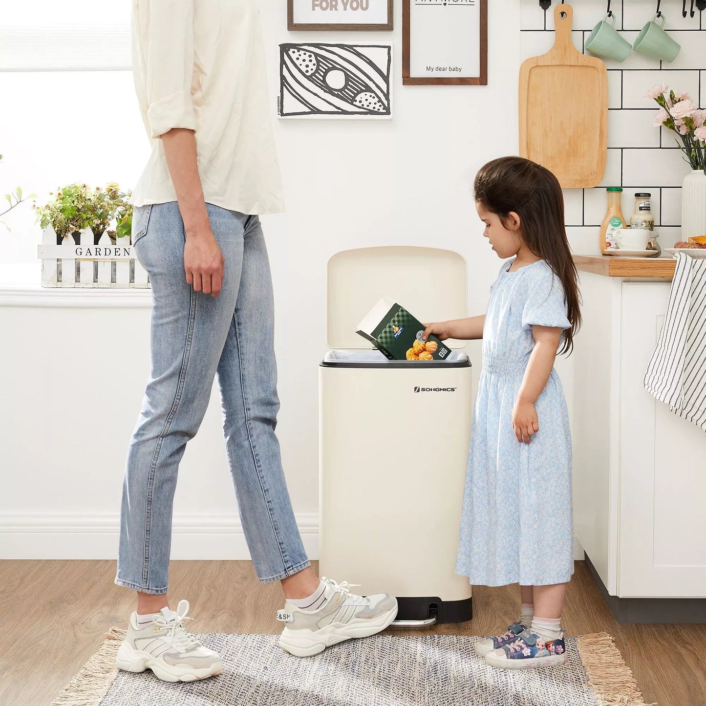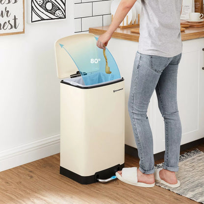 30-Liter-Mülleimer mit Pedal und Soft-CloseEin sauberes und aufgeräumtes Zuhause bedeutet mehr Komfort im Alltag.MultifunktionalKücheSchlafzimmerBadezimmerKinderzimmerRecycling ist auch einfach: Sie müssen nur auf das Pedal treten und den Müll in den Inneneimer werfen. Sie müssen den Behälter nicht einmal mit der Hand berühren, was für Hygiene sorgt. Darüber hinaus müssen Sie sich keine Sorgen machen, dass Ihr Hund den Mülleimer umwirft und der gesamte Küchenabfall auf Ihrem Boden landet. Der Deckel öffnet sich nur, wenn Sie auf das Pedal treten. Eine clevere Lösung für die Müllentsorgung: Dieser 30-Liter-Mülleimer ist robust und kompakt und überzeugt durch sein durchdachtes Design. Der Inneneimer lässt sich mithilfe der seitlichen Griffe leicht herausnehmen und reinigen; Die Öffnung an der Rückseite des Inneneimers verhindert ein Verrutschen Ihrer Mlltte. Maße: ca. 5 x 52 cm (L x B x H) Gesamthöhe (bei geöffnetem Deckel): 82 cm Gewicht: 4,5 kg Fassungsvermögen: 30 Liter Lieferumfang: 1 x Mülleimer In- und Outdoor passend Hinweise: Stellen Sie das Produkt auf ein ebener Boden. Schließen Sie den Deckel des Eimers. Reinigen Sie den Eimer nicht vollständig mit der Hand, da er automatisch schließt. Um das Produkt zu reinigen, wischen Sie es mit einem weichen, feuchten Tuch ab und verwenden Sie bei Bedarf ein mildes Reinigungsmittel