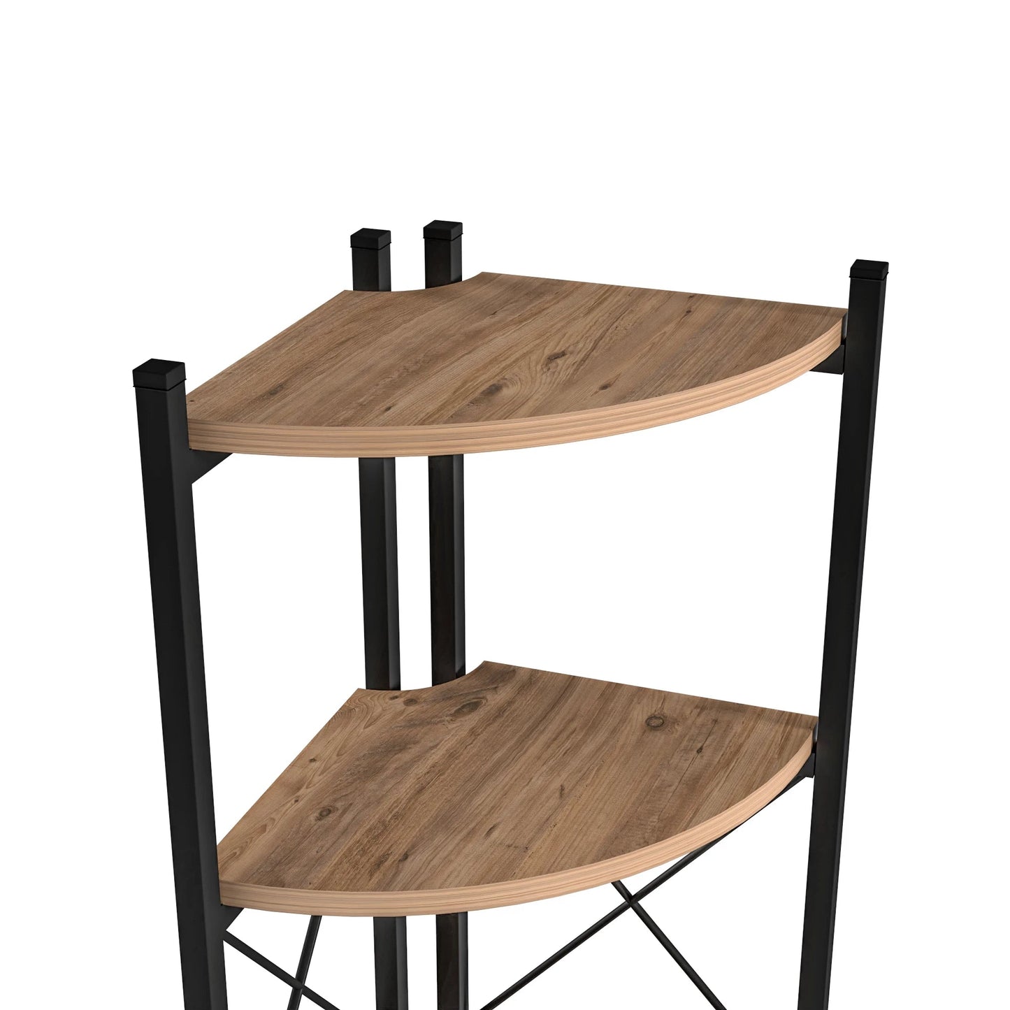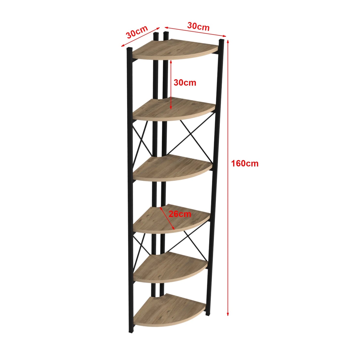 Das Eckregal besteht aus Spanplatten für die Regale und Metallrahmen für die Konstruktion. Die Maße betragen 160x30x30 cm (HxBxT) mit einem Abstand von 30 cm zwischen den Regalen und einer Tiefe von 26 cm pro Regal. Die Dielen sind holzfarben und der Rahmen ist schwarz.