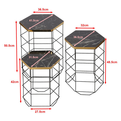 In And OutdoorMatch Stilvoller Beistelltisch Larkos – 3er-Set – Schwarzer Marmor-Look und goldfarben – Metall und Spanplatte