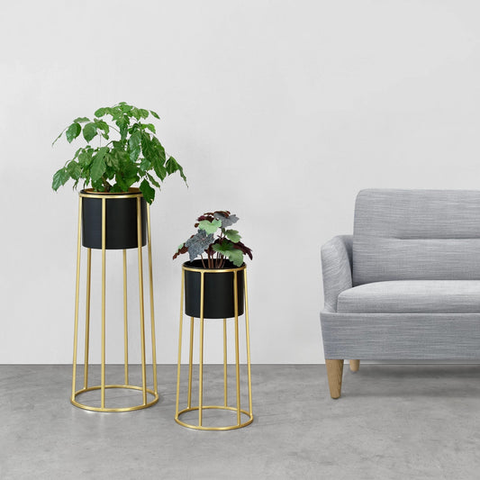In And OutdoorMatch Flowerpot Alana - On Stand - Metal - Set of 2 - Black and Gold-colored - Stylish Design