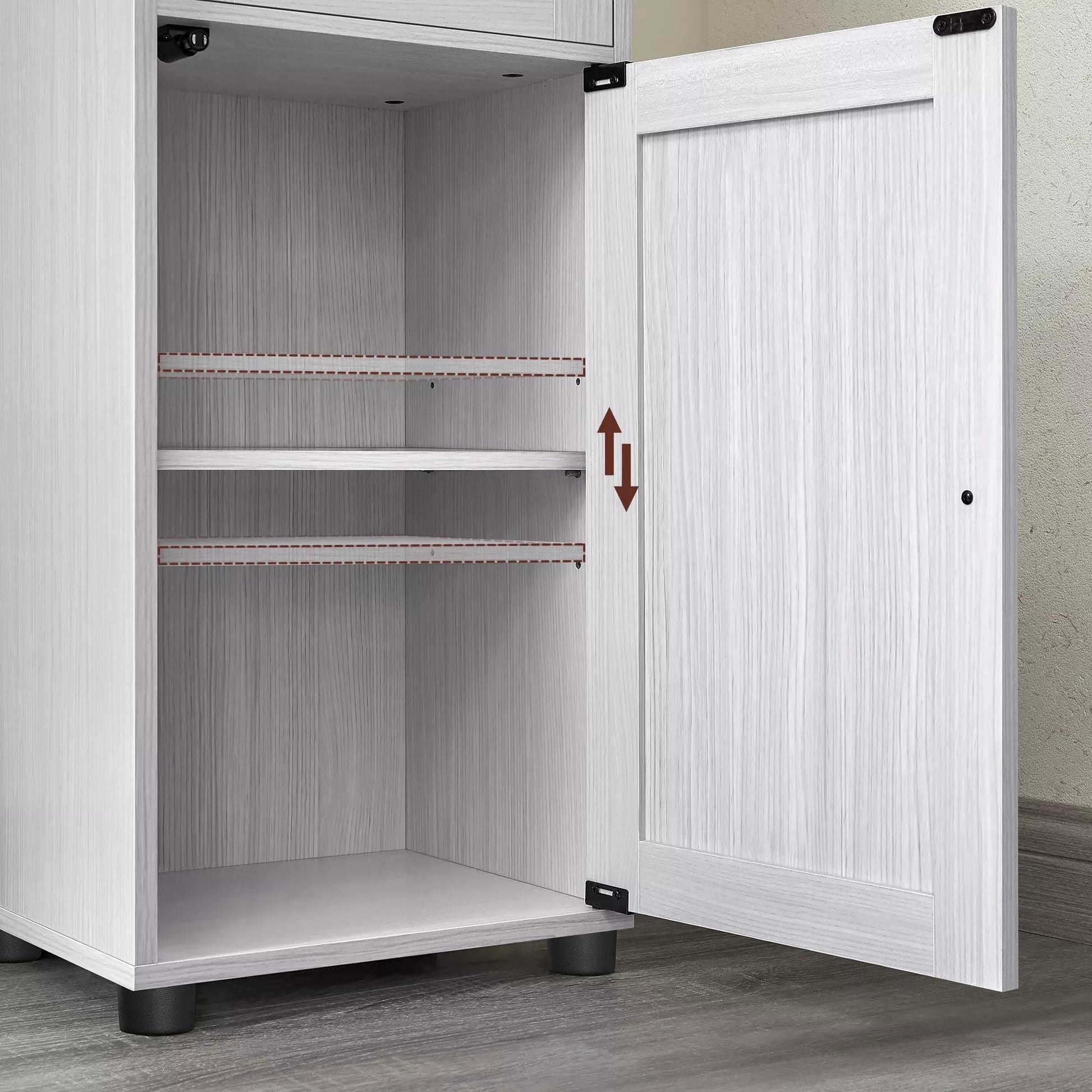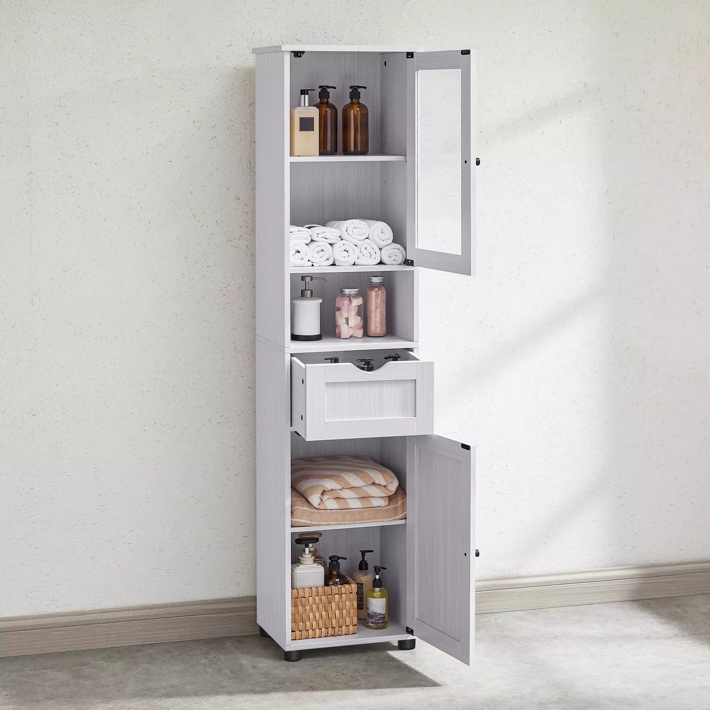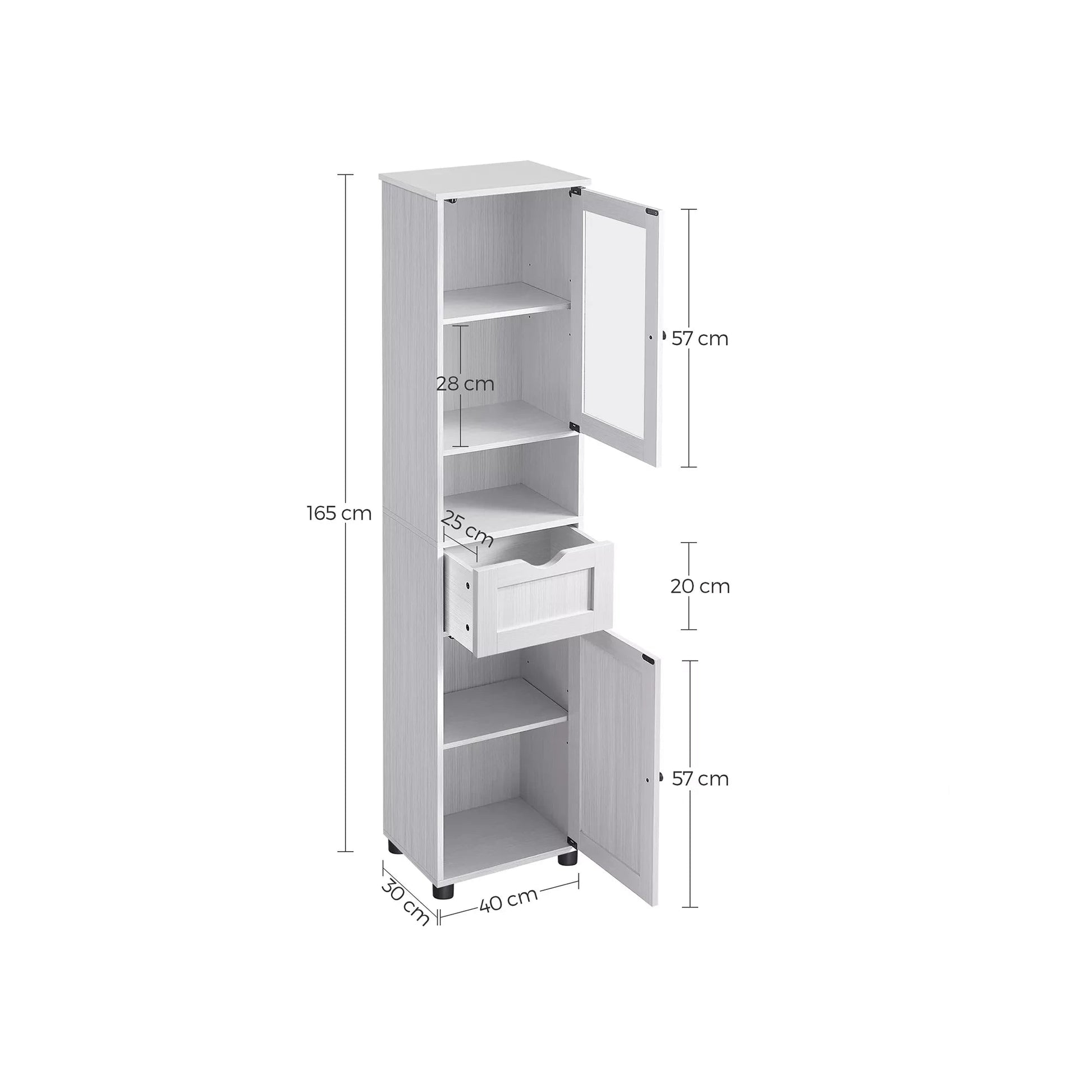 Product details: Color: white with wood grain Material: chipboard, glass Dimensions: 40 x 30 x 165 cm (L x W x H) Weight: 23.2 kg Max. static load capacity of the drawer: 4.5 kg Max. Static load capacity per shelf level: 9 kg Scope of delivery: 1 x bathroom cabinet 1 x accessory package 2 x anti-tip supports 1 x manual Inand Outdoormatch Notes: For safety reasons, children should not climb on or play with the product. Secure this product to the wall with the included anti-tip brackets to ensure safe use.