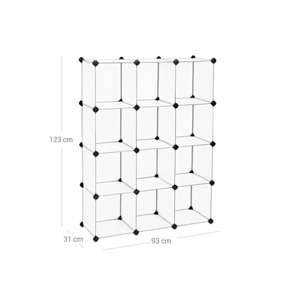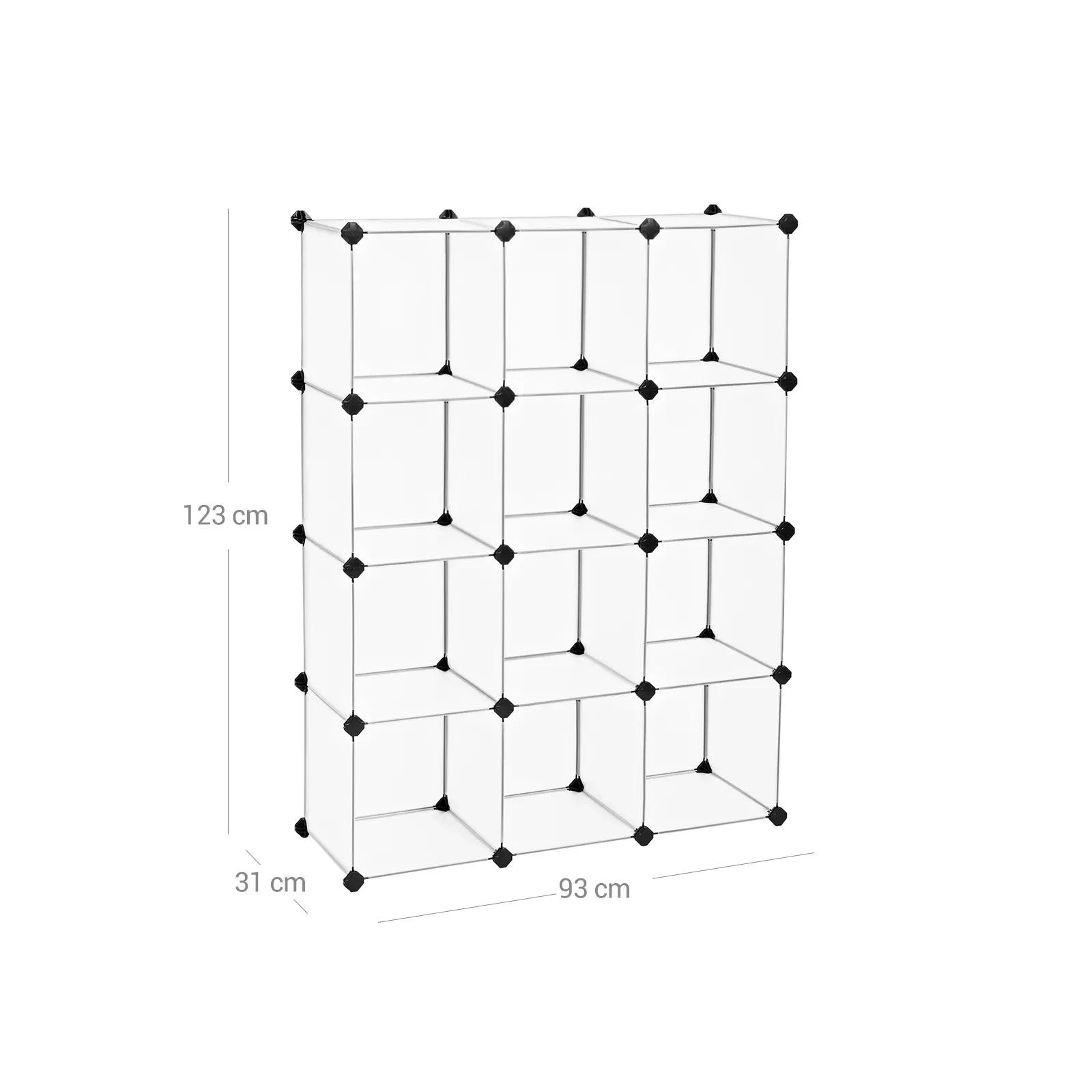 Staff! Too much clutter in my house! Here comes your salvation! With this multifunctional storage cabinet in semi-transparent white you can store all your small items in one place. This way you can quickly find the items you need, without having to search for a long time. Stability is a top priority: This storage unit consists of high-quality PP plastic sheets, ABS plastic connectors and iron wire frames, making it a stable storage option for your books, DVDs, shoes, etc. Endless possibilities are waiting to be implemented: this interlocking shelving system offers you a wide range of applications. You can put the cubes together the way you need them, so that the organizer optimally adapts to the space you have. Thanks to its simple and modern design, this shoe cabinet is also very suitable for your living room, garage or basement. Product details: Color: Semi-transparent white Material: PP plastic panels with metal wire frame, ABS plastic connectors Dimensions: 93 x 31 x 123 cm (L x W x H) Weight: 6.5 kg Max. Load capacity per cube: 10 kgUniversal shelf: The shelf is available in different configurations as desired. Let your creativity run wild. High Quality Plastic Connectors: Made of thickened ABS plastic, ensure long service life; 8 internally threaded slots increase the friction force between the plates and connectors to keep them firmly together. Seamless design: The slightly curved design on the 4 corners of the metal edge ensures that the connectors and plates are connected extra tightly, so that dust or insects cannot pass through. Extra safety: Each InAndOutdoormatch plug-in system is equipped with tip-over protection, so that you can anchor the plug-in shelf to the wall. Scope of delivery: 43 x plastic plate in semi-transparent white (30 x 30 cm) 46 x ABS plastic connectors in black 1 x rubber hammer 2 x tip-over protection 1 x manual (DE, EN, FR, ES, IT) Inand Outdoormatch Notes: The product must not come into contact with sharp objects. Also keep it away from sources of ignition. Do not sit on the product. Do not leave the product outside for long periods of time to prevent damage from the weather. All plastic panels must be pressed down completely during installation. After completing each row, check that the wire frames are pushed all the way into the connector to increase the stability of the product.
