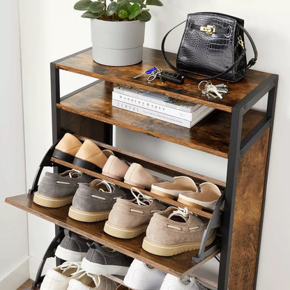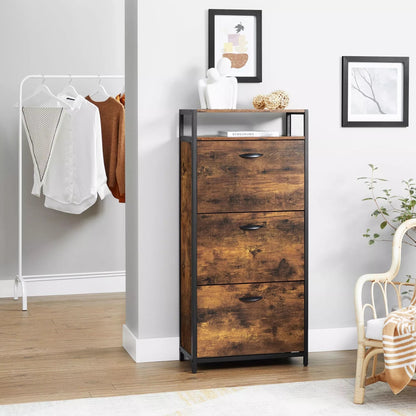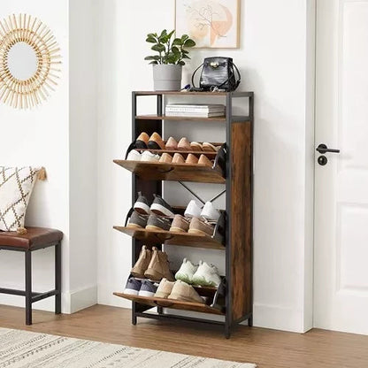 IMPRESSIVE STYLE: Style should also be present in a shoe closet. The mix of rustic brown chipboard and black steel frame provides a chic industrial touch that will certainly impress your guests. GIVE A LITTLE, GET A LOT: This narrow shoe cabinet (60 x 30 x 130 cm) with 3 compartments and height-adjustable inner shelves offers space for 12-18 pairs of shoes and takes up little space. DISPOSABLE SHOES AND CLEAN HALLWAY: The shoes are no longer lying around everywhere. When you get home, open the closet door and put your shoes in it. Give your hallway a new look now!