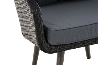 This chic armchair fits perfectly into the Scandinavian style. Thanks to the rounded backrest and upholstered cushions, the garden chair is very comfortable and ideal for long summer evenings with friends. Thanks to the stable and weatherproof frame made of poly rattan and aluminium, it can be placed anywhere and also looks good indoors. The high-quality, lacquered aluminium legs with a wood look are easy to clean and offer a secure stand thanks to the floor protector caps. The lounge chair is available with a seat height of 40 cm or 45 cm. You can order it separately or as an addition to the Andrea balcony set and lounge set.