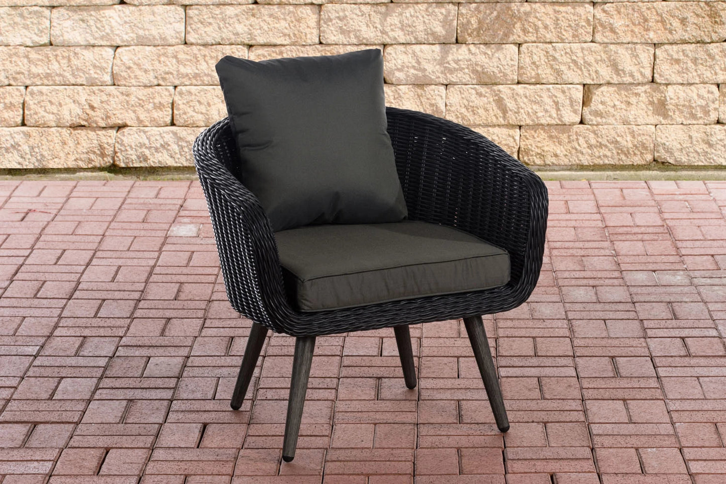 This chic armchair fits perfectly into the Scandinavian style. Thanks to the rounded backrest and upholstered cushions, the garden chair is very comfortable and ideal for long summer evenings with friends. Thanks to the stable and weatherproof frame made of poly rattan and aluminium, it can be placed anywhere and also looks good indoors. The high-quality, lacquered aluminium legs with a wood look are easy to clean and offer a secure stand thanks to the floor protector caps. The lounge chair is available with a seat height of 40 cm or 45 cm. You can order it separately or as an addition to the Diann balcony set and lounge set.