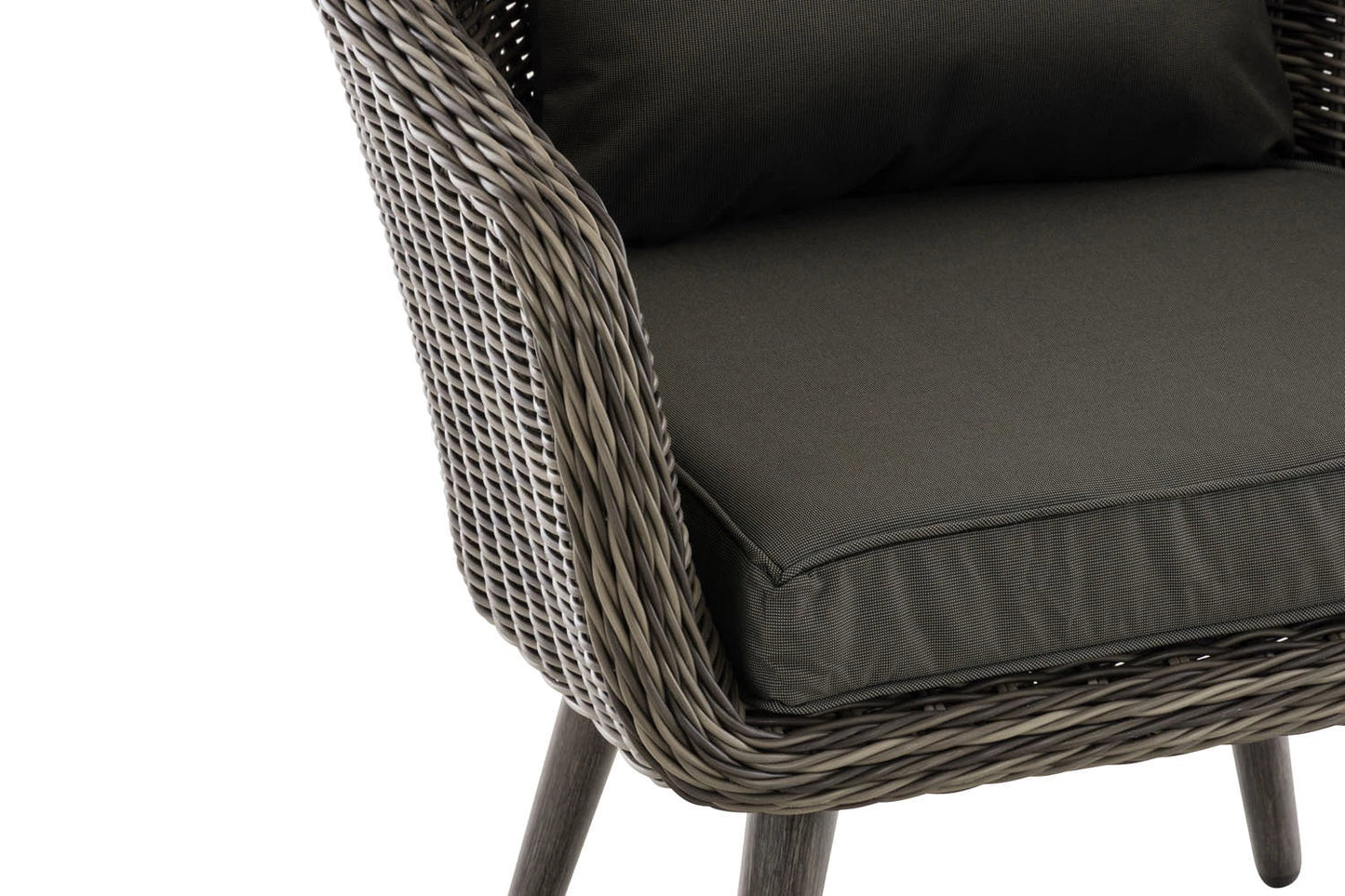 This chic armchair fits perfectly into the Scandinavian style. Thanks to the rounded backrest and upholstered cushions, the garden chair is very comfortable and ideal for long summer evenings with friends. Thanks to the stable and weatherproof frame made of poly rattan and aluminium, it can be placed anywhere and also looks good indoors. The high-quality, lacquered aluminium legs with a wood look are easy to clean and offer a secure stand thanks to the floor protector caps. The lounge chair is available with a seat height of 40 cm or 45 cm. You can order it separately or as an addition to the Ronnie balcony set and lounge set.