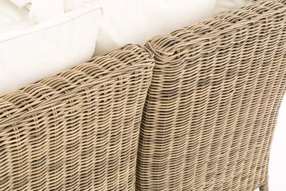 The UV-resistant material polyrattan, which is particularly suitable for outdoor use, resembles conventional rattan fabric, but is much more robust. The high-quality, 5 mm thick, round polyrattan fibers are waterproof, easy to clean and UV-resistant, so that they retain their color depth even with frequent and long-term use. In combination with a light structure, this noble shade provides the absolutely natural look of this furniture set.