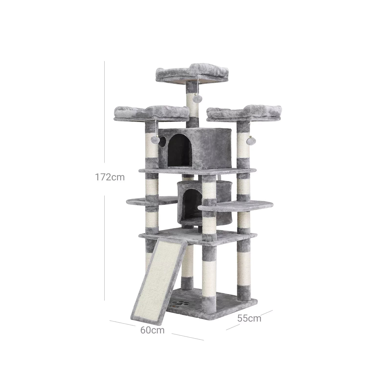 Product details: - Color: light gray - Material: chipboard, plush, sisal - Dimensions: 60 x 55 x 172 cm (L x W x H) - Weight: 29.1 kg Scope of delivery: - 1 x scratching post - 1 x manual (DE, EN, FR, ES, IT)