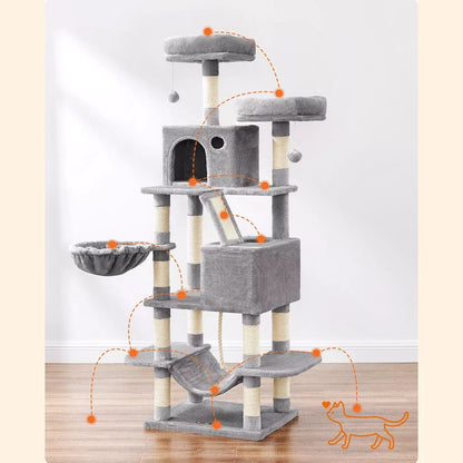 High-quality materials, a reinforced bottom and anti-tilt protection provide a stable and safe surface so that your cats can play safely. The entire scratching post is covered with soft plush, which provides a cozy feeling. With 2 pompoms, a play rope, 2 caves, a basket and a hammock, your cats will never be bored on this scratching post. 13 scratching posts and 1 scratching board entertain those restless claws and prevent them from ruining your furniture. Also suitable for kittens and older cats. Both the multi-level design and the ramp make it easier to climb up and down.