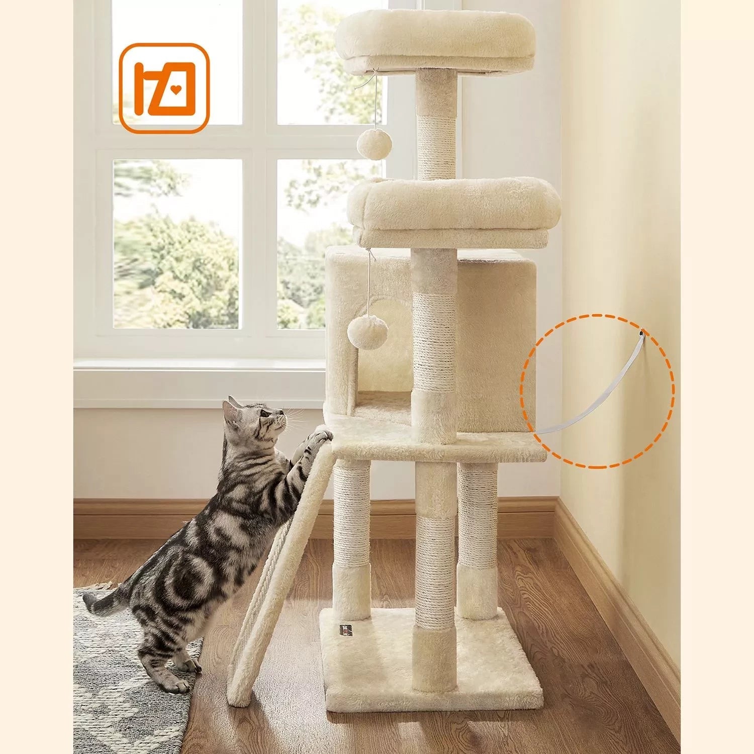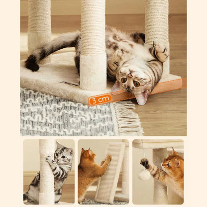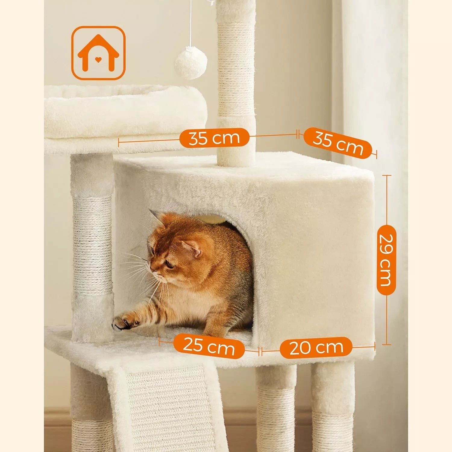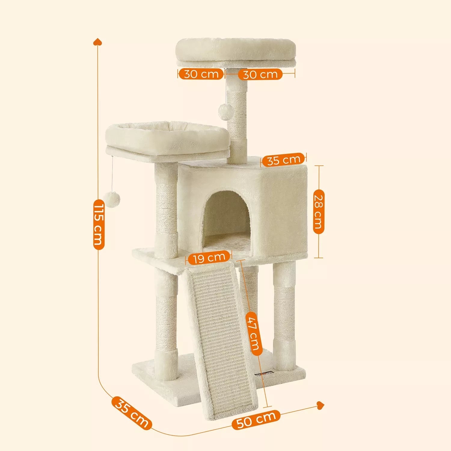 In the creative workshops of InAndOutdoorMatch, two cute kittens jump around, examine all scratching posts personally and give their animal feedback. This way, InAndOutdoorMatch's designers discover first-hand whether the products meet the requirements of spoiled whisker wearers. Your sweet cat can enjoy the following features: - 2 viewing platforms at the top for observation - 1 comfortable nest for hide-and-seek - Tree trunks with sisal on each level for claw sharpening - 1 large scratching board that doubles as a staircase - Layered construction for easy to get on and off - 2 fur balls for extra playing fun Product details: - Color: beige - Material: chipboard, plush, sisal - Dimensions: 50 x 35 x 115 cm (L x W x H) - Weight: 10.3 kg Scope of delivery: - 1 x Scratching post - 1 x Anti-tip device - 1 x InAndOutdoorMatch Manual Notes: - If the cat house is damaged, please repair or replace it in time to avoid injury from damaged parts. - If your cats chew it, remove the toy immediately and store it in a place that is not accessible to your cat.