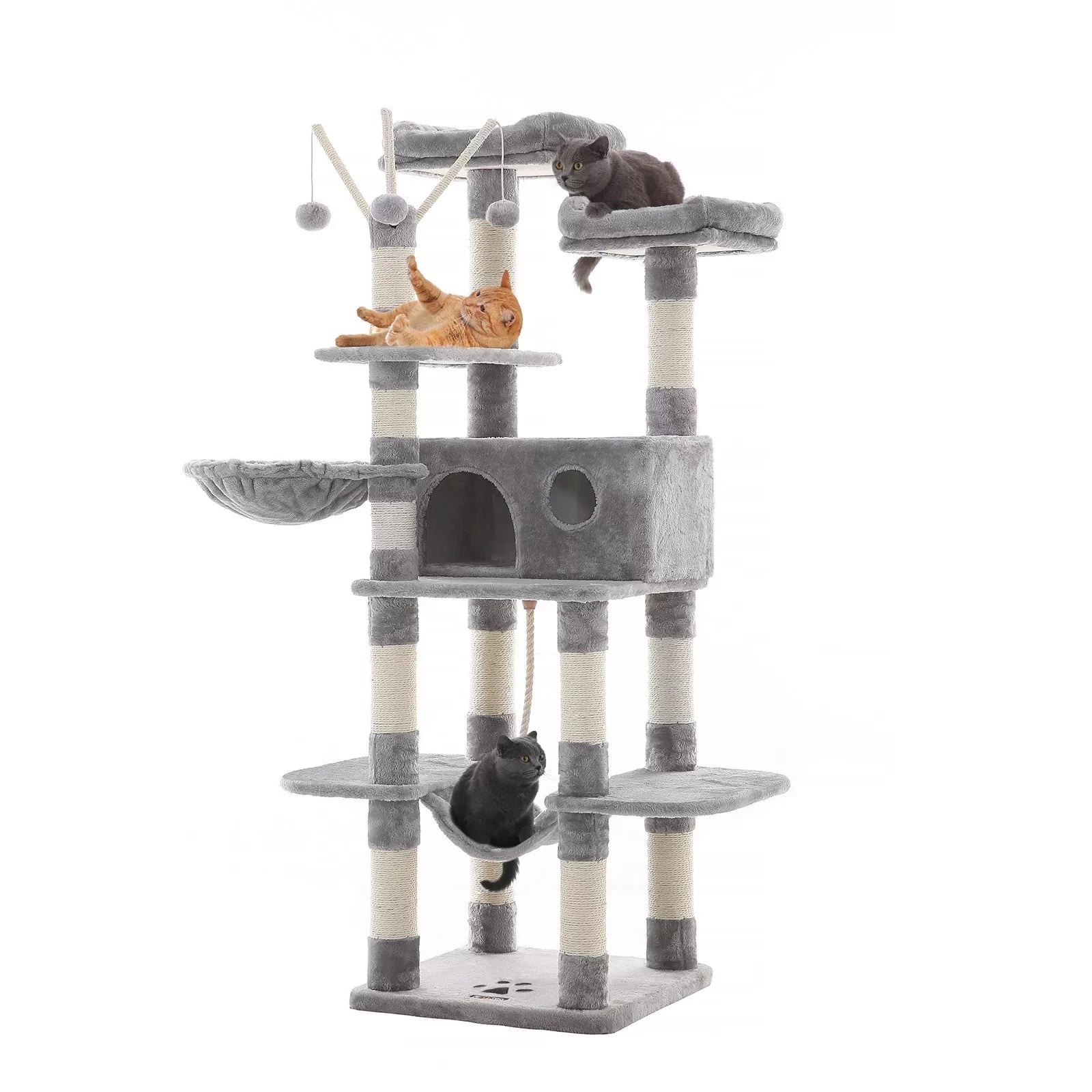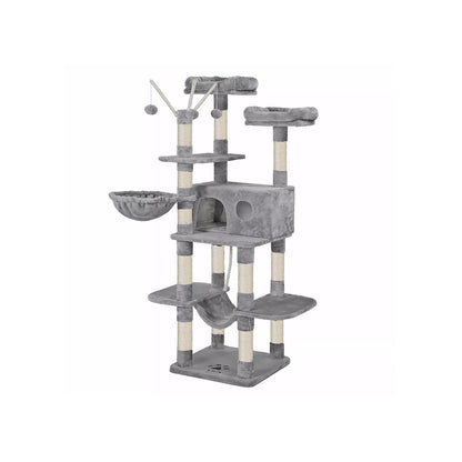 In the creative workshops of InAndOutdoorMatch, two cute kittens jump around, examine all scratching posts personally and give their animal feedback. This way, InAndOutdoorMatch's designers discover first-hand whether the products meet the requirements of spoiled whisker wearers. The highlights of this scratching post at a glance: - quite large; accommodates 2 cats, each weighing no more than 7kg - 2 well-padded viewing platforms with raised edges for relaxing - Comfortable nest for hide-and-seek and relaxation - Sturdy lounger and hammock for napping - Wood-reinforced base and anti-tip for more stability and safety - 3 removable sticks with hairballs and a play rope for more playing fun - Cover made of sturdy, soft plush Product details: - Color: light gray - Material: chipboard, plush, sisal - Dimensions: 50 x 50 x 164 cm (L x W x H) - Weight: 18 kg Scope of delivery: - 1 x scratching post - 1 x anti-tilt protection - 1 x mounting accessories - 1 x manual (DE, EN, FR, ES, IT) InAndOutdoorMatch Notes: - If the cuddle cave or the cover is damaged, please contact our customer service immediately for replacement or other solution to avoid injury from broken parts. - Remove the fur pads immediately if your cat chews them.