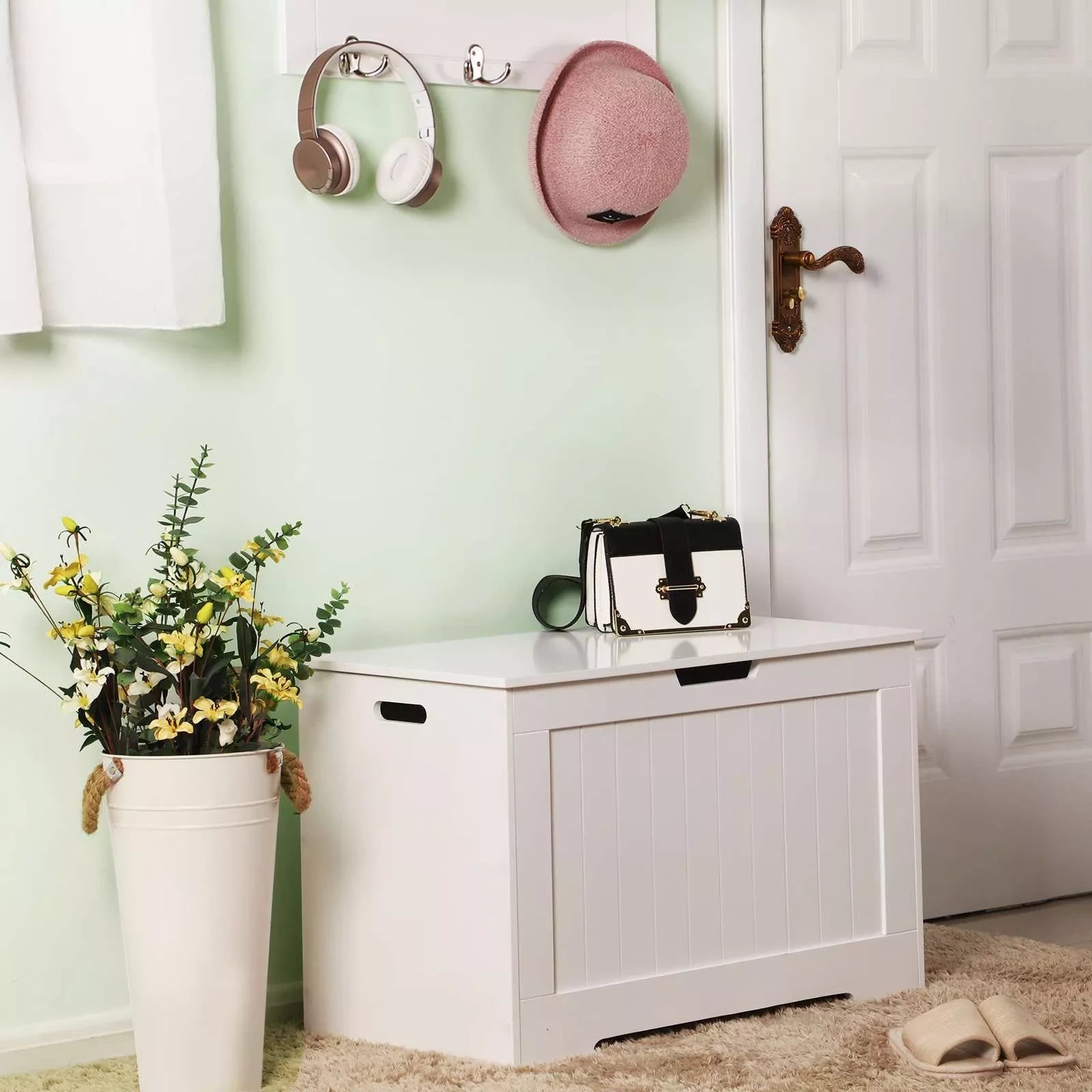 This storage bench with classic white finish fits easily in your entryway, playroom, bedroom or living room and works great as a shoe bench, bedside table and toy chest. Use the storage bench to hide books, clothes, shoes and blankets out of sight and takes up little space with its compact size of 76 x 40 x 48 cm. Safe and easy to use with safety hinges and built-in handles. The whole frame is made of E1 grade MDF boards, it is sturdy and durable, the painted finish is smooth and adds a sense of elegance.