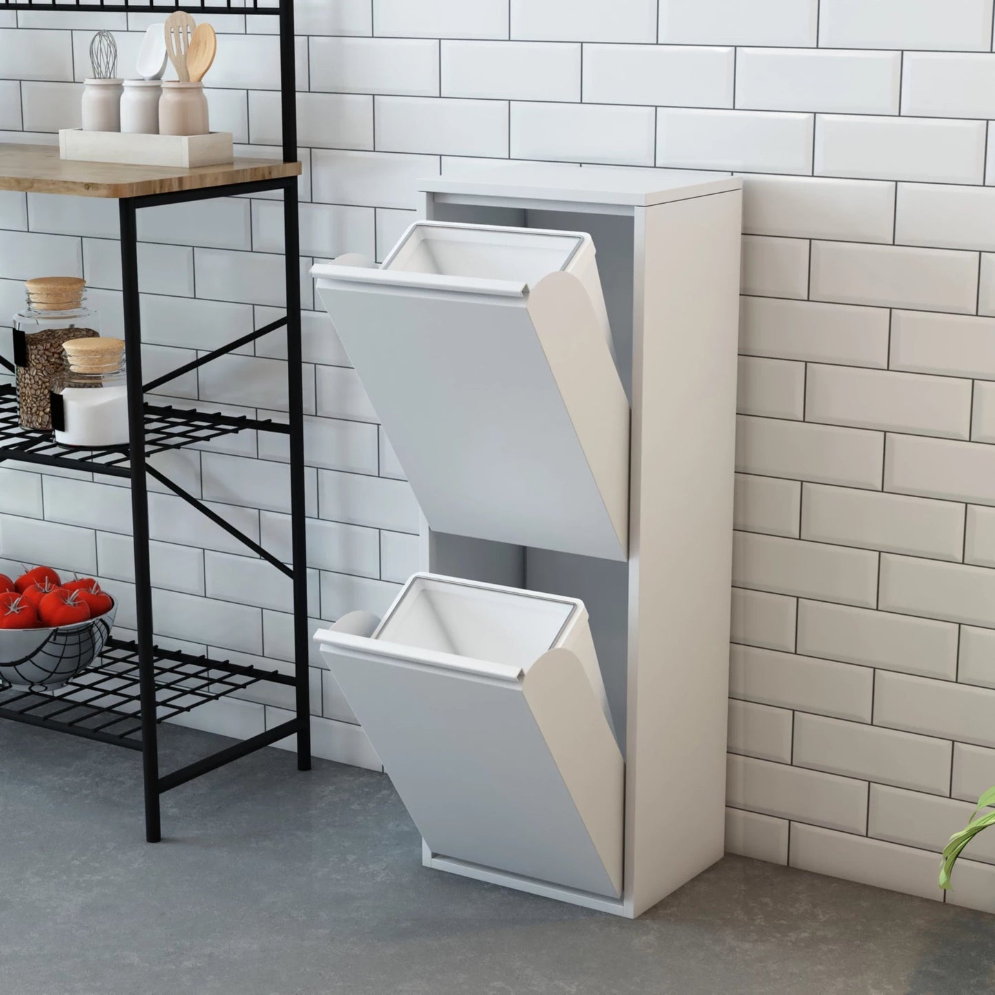 - Space-saving waste separation cabinet with 2 tilting compartments