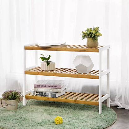 The InAndOutdoorMatch shoe rack is the ideal organizer for the hallway or corridor. You get a chic shoe rack that convinces with good workmanship and is extremely decorative. Not only does it keep your home organized, you can also use it to display shoes and decorative items in the store. Shoes, bags, plants, baskets and bathroom accessories such as towels can be placed in the 4 storage compartments. Here are more ideas. Why should you choose the Songmics shoe rack? Songmics is always customer-oriented and does everything it can to deliver high-quality items and good value for money. We have excellent customer service and we will do our best to solve your problems. Note: - Do not sit or lean on it. Product details: - Dimensions: 70 x 55 x 26 cm (W x H x D) - Material: Bamboo - Package dimensions: 69 x 31 x 11 cm - Weight: 3.4 kg Scope of delivery: - 1 x 3-tier shoe rack