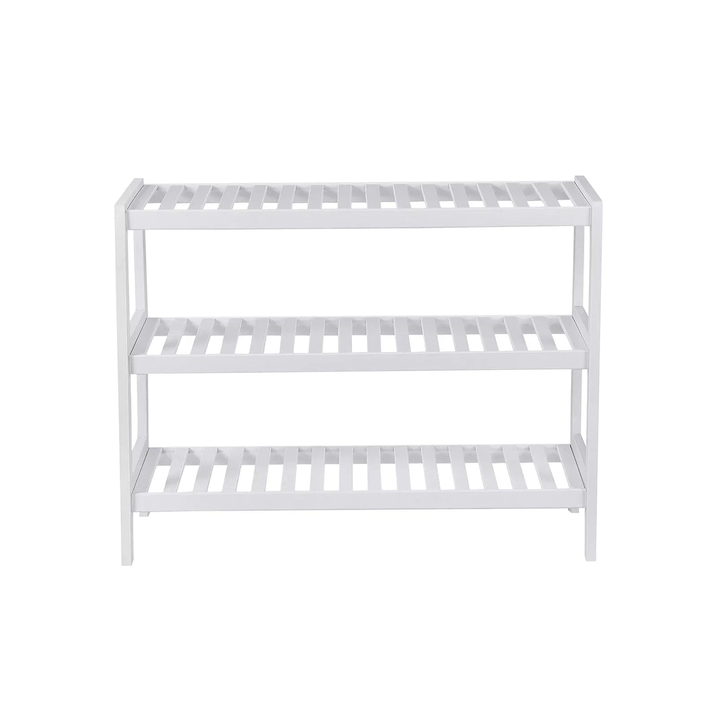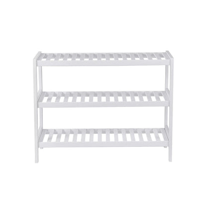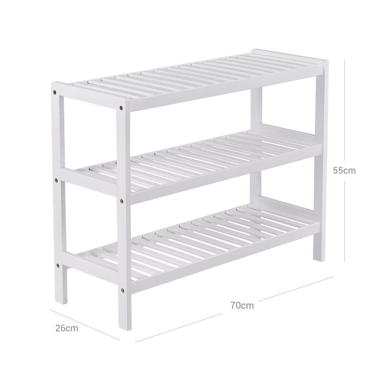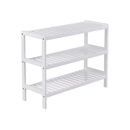 The sturdy storage rack is made of renewable, environmentally friendly bamboo and is versatile. Thanks to its modern design, it suits different living styles. The plank made of robust bamboo pieces ensures good stability under high loads. With this, it can meet your storage needs. In the hallway it can be used to store shoes. In the bathroom you can place your shower supplies on this. You can also use it in the study room to store your books. You probably have more ideas! Product details: Dimensions: 70 x 55 x 26 cm (W x H x D) Package dimensions: 69 x 31 x 11 cm Color: white Material: bamboo Load capacity per level: 10 kg Total load capacity: 30 kg Weight: 3.4 kg Scope of delivery : 1 x shoe rack 1 x hardware bag 1 x manual (DE, EN, FR, ES, IT)