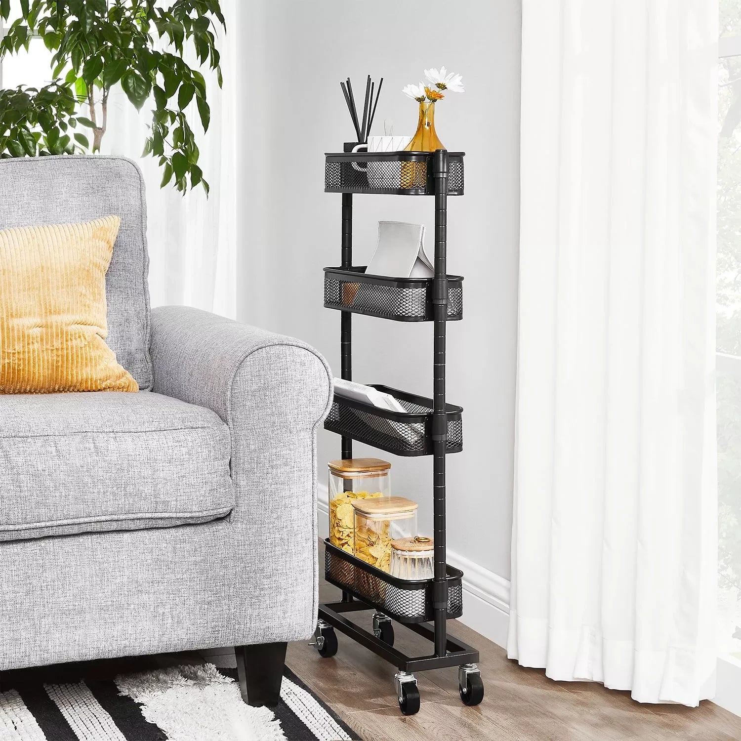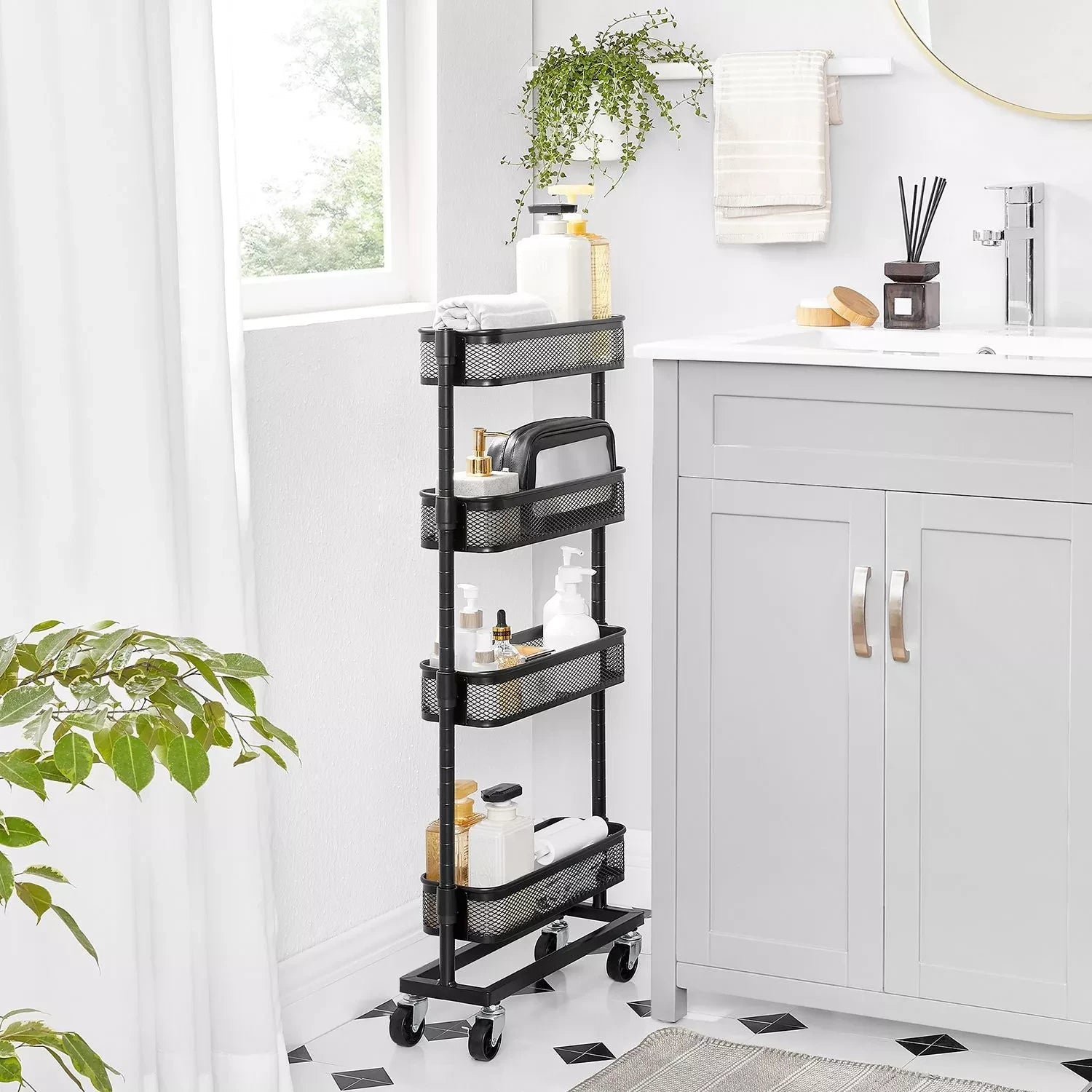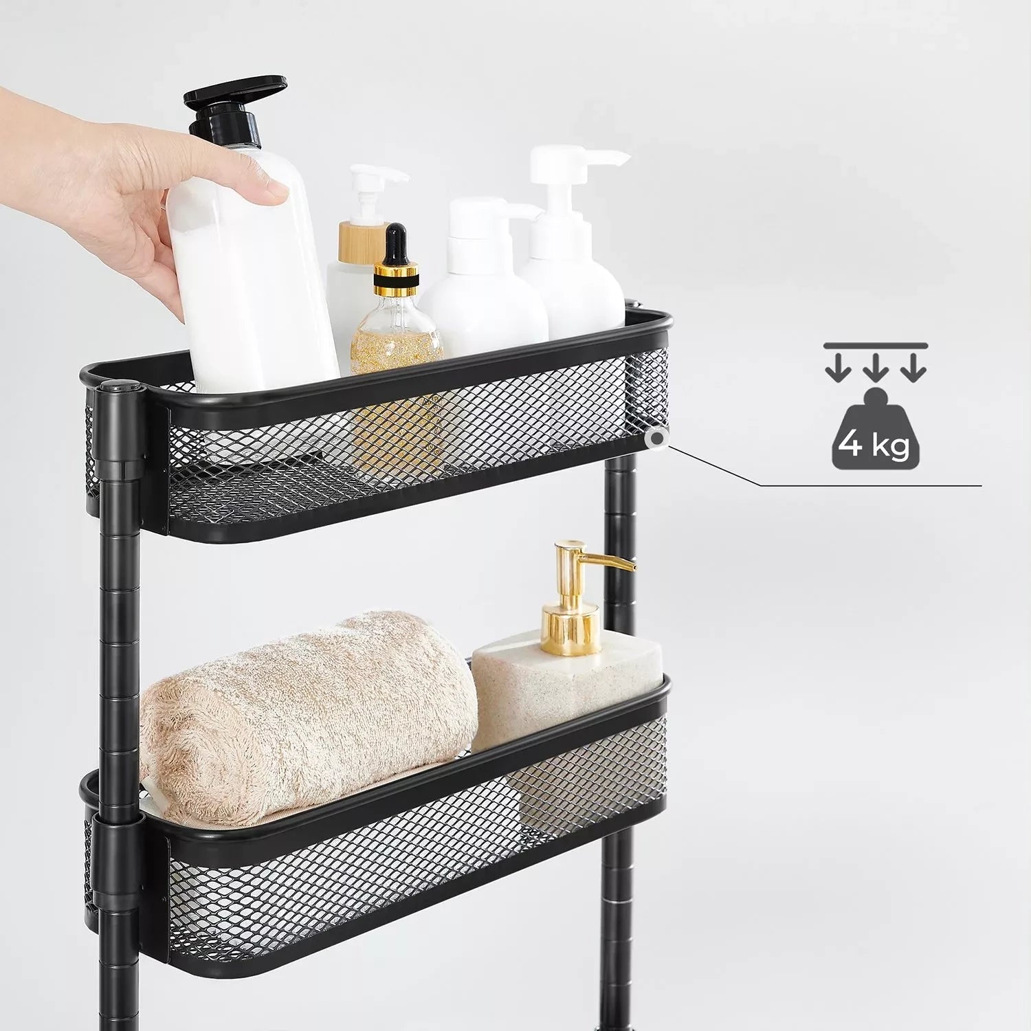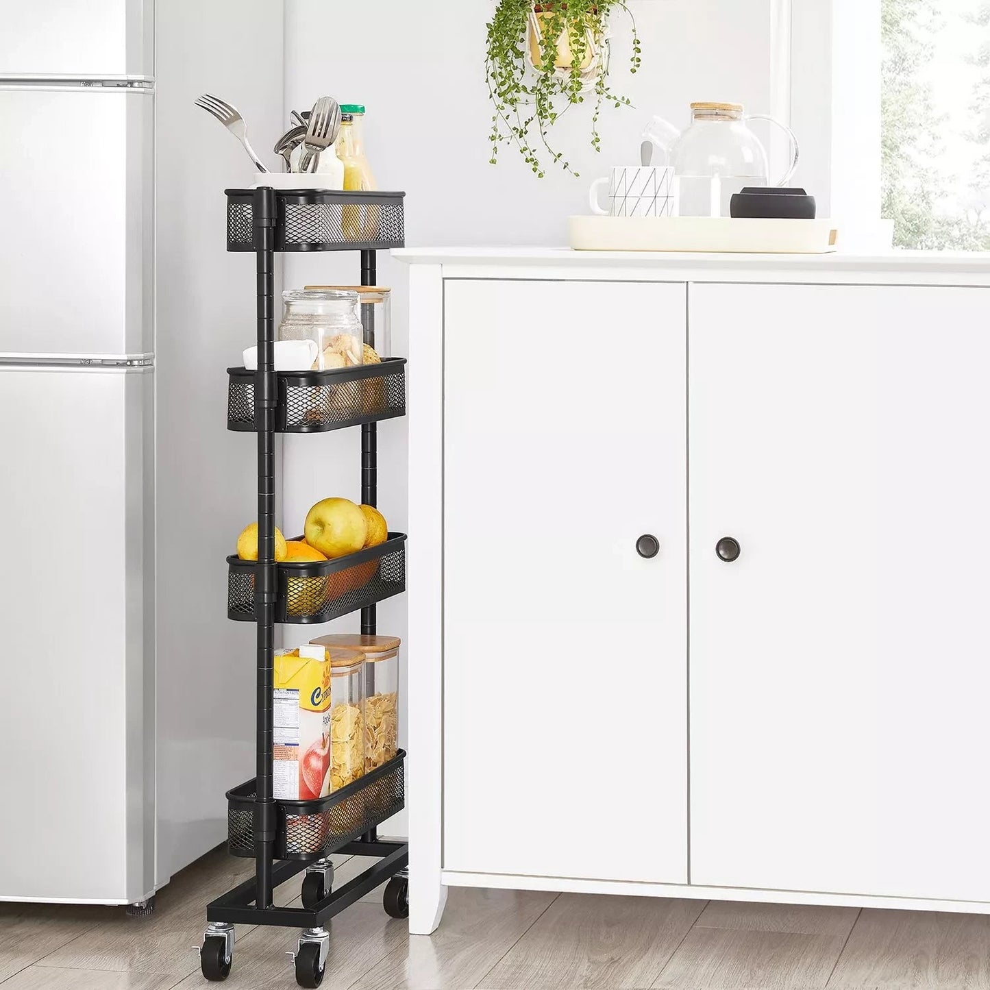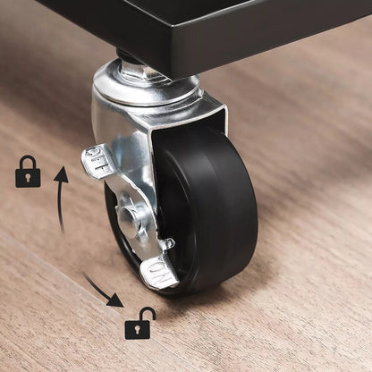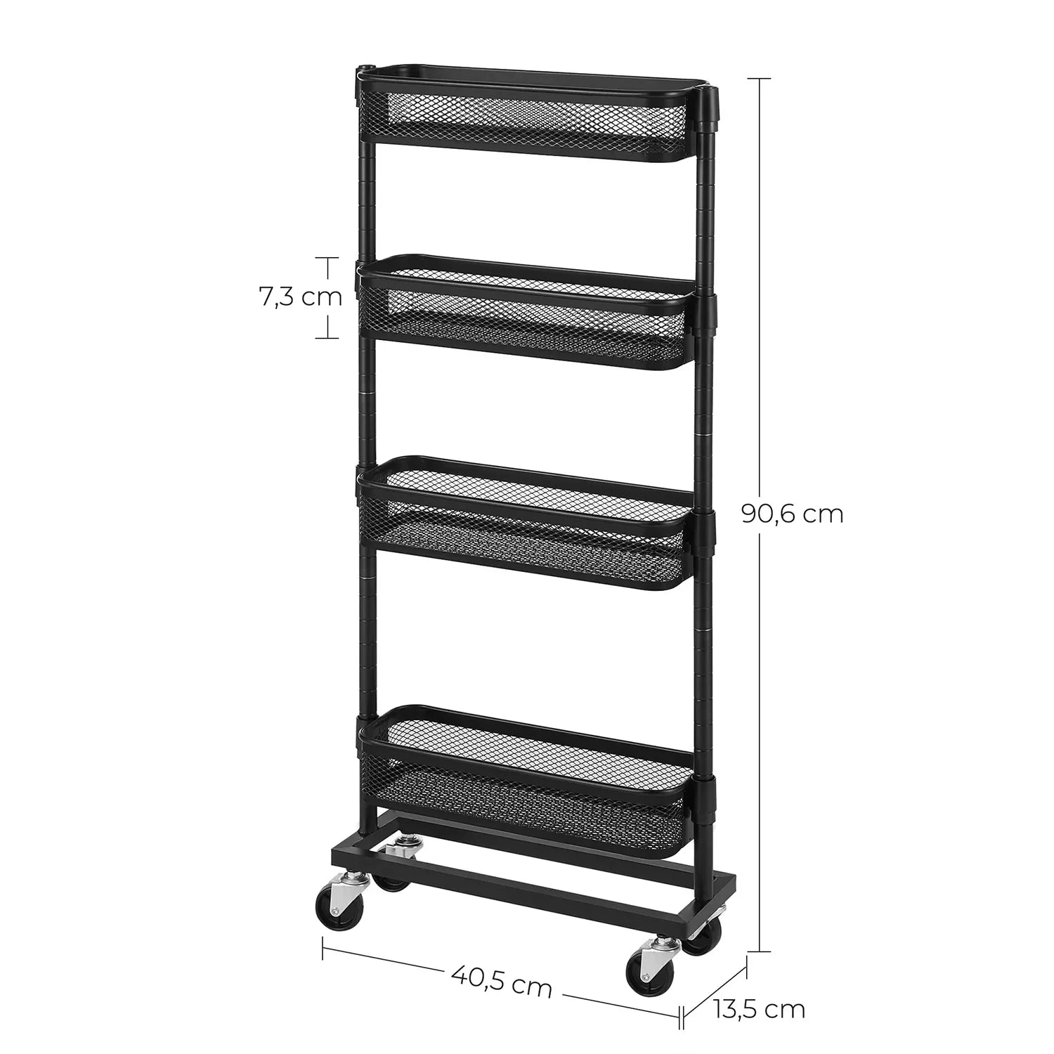 Perfect next to your bathtub: fill this practical bathroom rack with shampoo, shower gel and a sponge, roll it up next to your bathtub and jump into a warm bubble bath! Practical next to your countertop: Place spices, sauces, cooking oil and other frequently used cooking ingredients on this kitchen rack and slide it into the small niche next to your sideboard. So salt, pepper and olive oil are ready when you create your famous couscous salad. Handy next to your desk: Place small boxes with breadcrumbs, your stapler and hole punch on this flexible trolley and slide it next to your desk. This gives you quick access to important work accessories without your desk collapsing into chaos. Product details: - Color: black - Material: steel - Dimensions: 40.5 x 13.5 x 90.6 cm (L x W x H) - Weight: 3.3 kg - Max. static load capacity per level: 4 kg Scope of delivery: - 1 x narrow mobile shelf - 1 x accessory package - 1 x manual (DE, EN, FR, IT, ES)