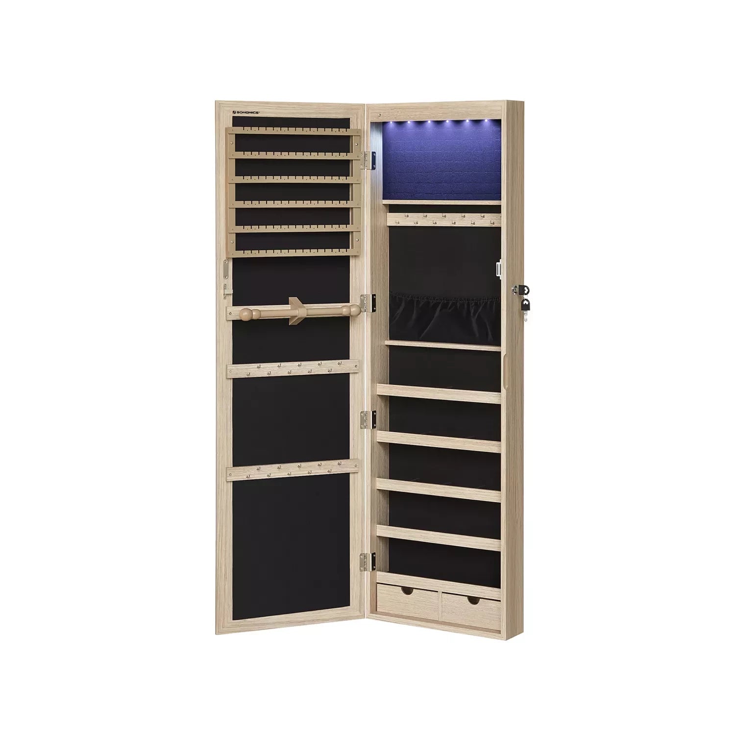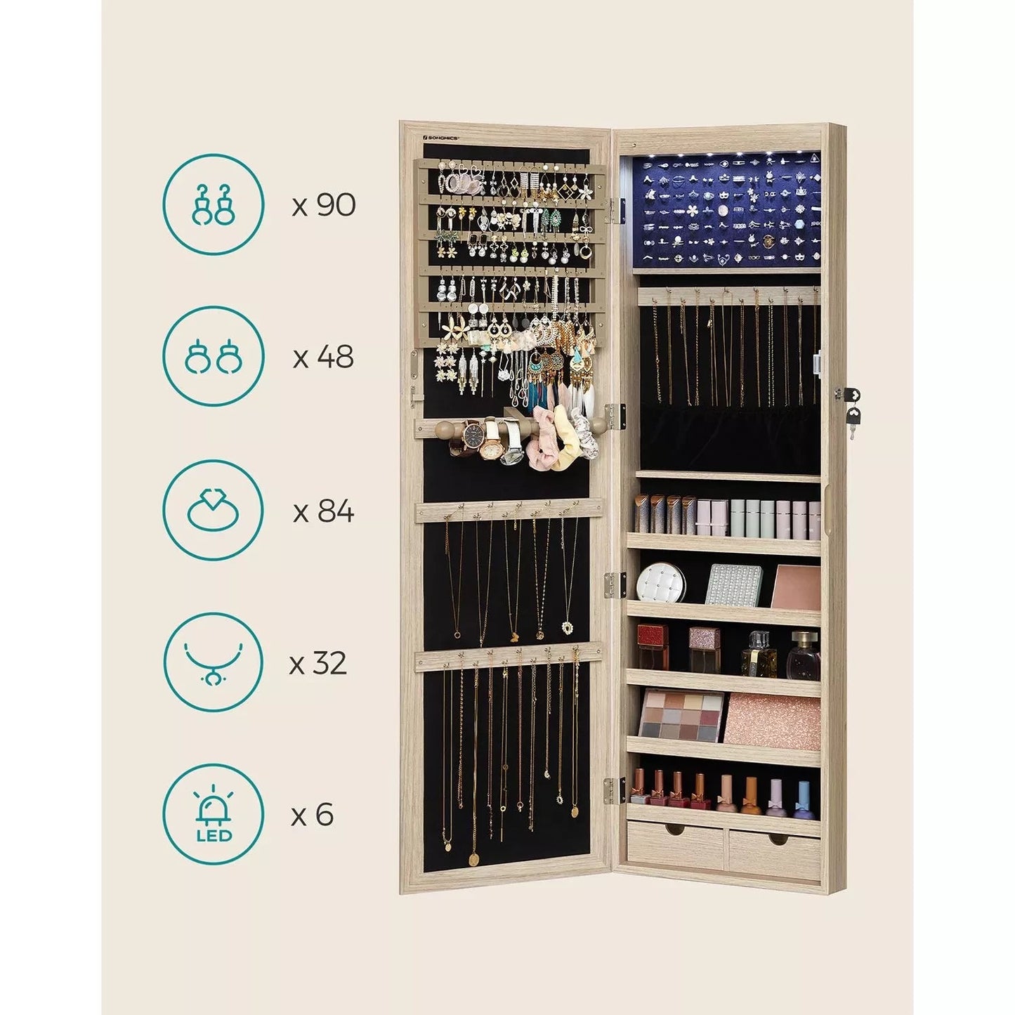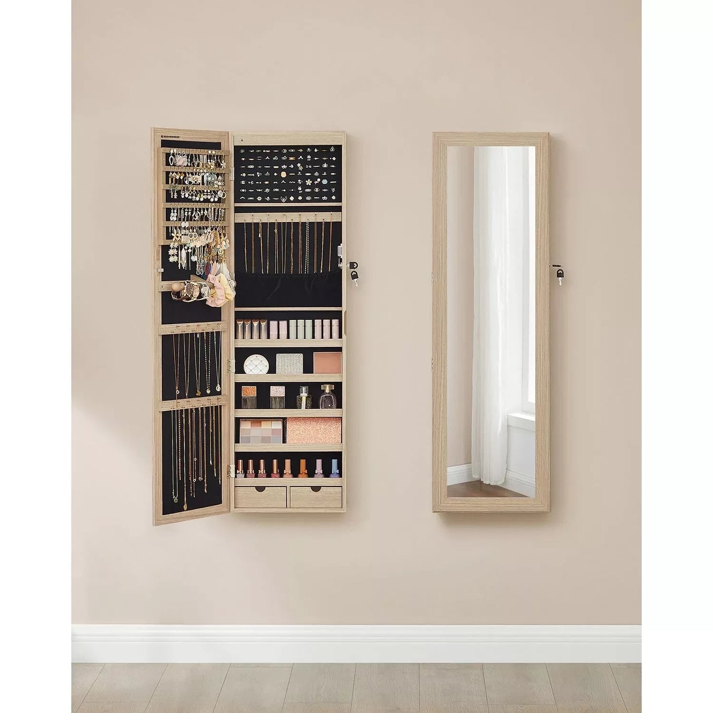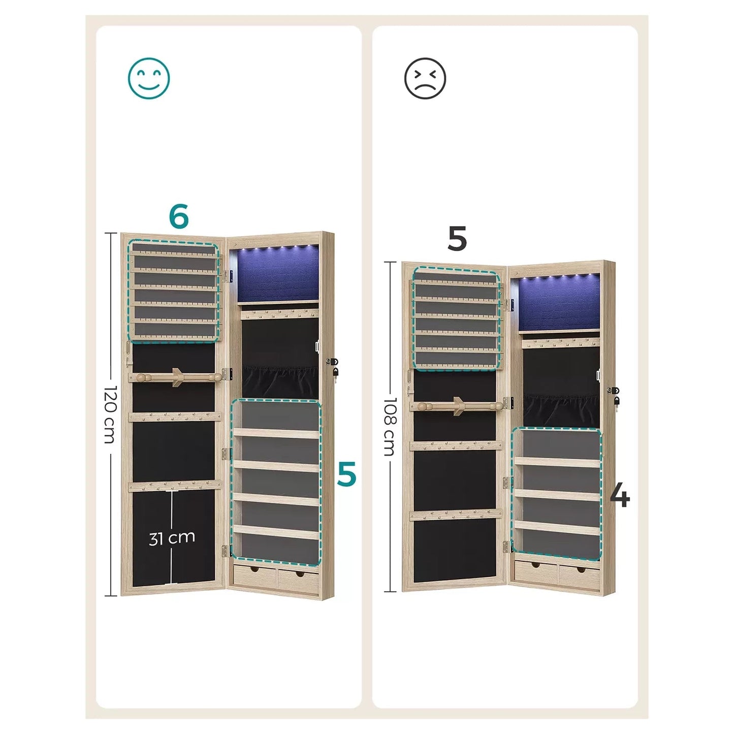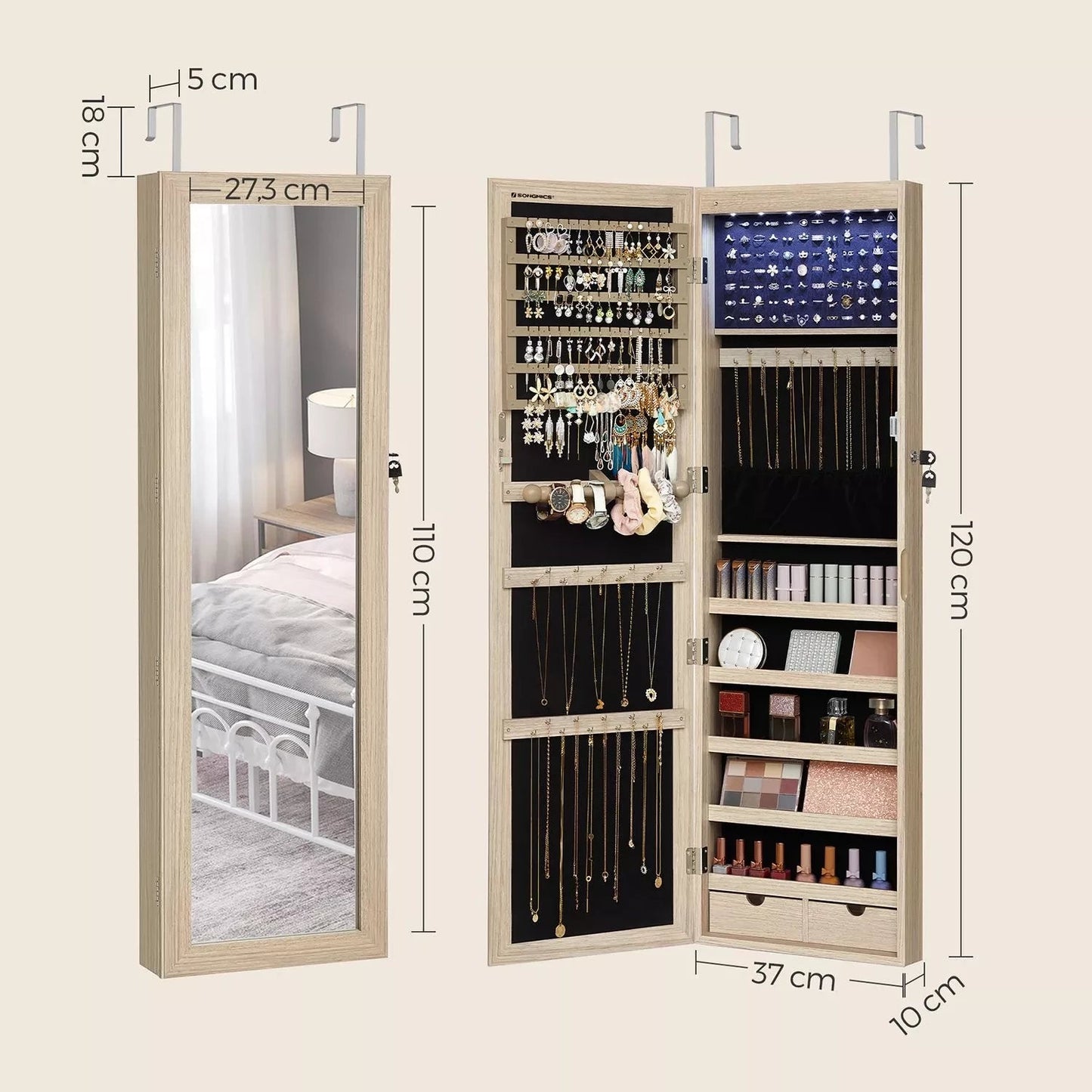 When you look at the pile of mismatched trinkets taking up your dressing table, what would you most like to do? Please don't throw them away in the next drawer, use this jewelry cabinet from Inand Outdoormatch! Store jewelry like a pro: Store earrings on the earring holders, necklaces on the hooks and bracelets on the bracelet bar. But what about the subjects that are still free? For example, fill them with jewelry care products, perfumes or other small items. The spacious and smart layout of this jewelry cabinet allows you to organize your jewelry like a professional. Obstacle-free beauty routine: Now that you have your jewelry neatly stored, you no longer have to frantically search for lost earrings or pick apart your tangled necklaces. the morning. Instead, simply choose the matching jewelry from this all-in-one jewelry cabinet and check out your outfit in the full-length mirror before leaving the house. From now on, every morning will be wonderful! Product details: Color: oak-colored Material: MDF (medium density fiberboard), velvet, glass Total dimensions: 37 x 10 x 120 cm (L x W x H) Mirror size: 27.3 x 110 cm Weight: 10 kg Scope of delivery: 1 x hanging jewelry cabinet 2 x wall hooks for hanging the cabinet 1 x accessory pack 1 x instructions In and outdoor match Notes: Remove the batteries if you do not plan to use the LED lights for an extended period of time. To prevent deformation, this product should not be placed in a humid environment.