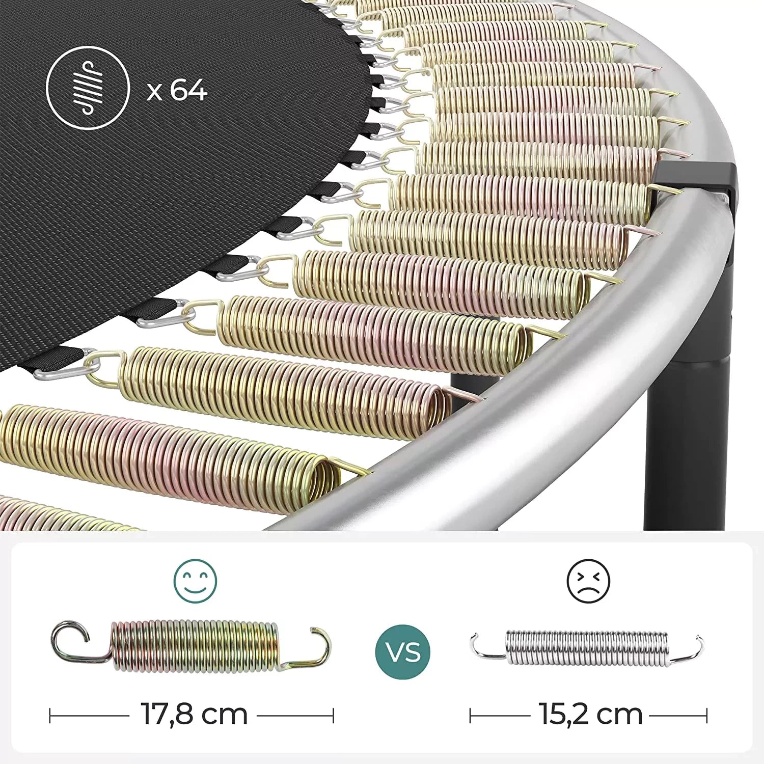 This trampoline from InandOutdoormatch is brand new on the market in 2020 and offers both you and your family a 1A jumping experience. Because safety is our priority, the galvanized and powder-coated base is stable and rust-resistant. The 4 W-shaped legs keep the jumping mat in balance. This jumping device is of course destined as a gift for your children. But of course you can also use it, because the trampoline can carry up to 150 kg. Included in delivery are a jumping mat, an edge cover, a safety net, handrails and a ladder – everything you need to have fun outdoors! Technical detailsMax. Load capacity: 150 kg Height between ground and trampoline surface: approx. 76 cm Made of high-quality galvanized steel tubes, stainless 64 galvanized steel springs Waterproof and UV-resistant edge cover High-quality safety net High-quality jumping mat - UV-resistant The handrails are padded with EPE foam Scope of delivery : 1 x trampoline 1 x ladder 1 x accessory pack 1 x manual (DE, EN, IT, FR, ES)Inand Outdoormatch Notes: Do not hang on the edge of the safety net. Remove all movable objects you are carrying before using the trampoline. It is prohibited for children under 3 years old. This trampoline is prohibited. Do not do somersaults on the trampoline. For private use only. More than one person is not allowed to use the trampoline at the same time as this will lead to collisions. Remove the trampoline in stormy or winter weather (in these cases, especially remove the safety net, jumping bed and edge cover). Store the trampoline in a dry and clean place. This product comes in 2 packages. Do not install the device until you have received all the individual parts.
