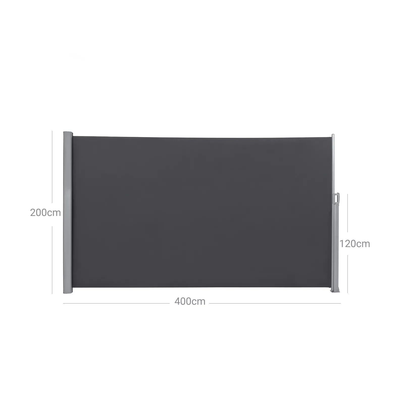 Privacy screen for terrace and balcony Thanks to the side awnings from Inand Outdoormatch, you can enjoy breakfast on your terrace without having to fear the prying eyes of your neighbors. You can also use the shade to block harmful rays of the sun. This way you can relax and enjoy the warm summer days outside. Suitable for indoor and outdoor spaces You can use this all-round talent both indoors, such as in open-plan offices, consultation rooms, changing rooms or photo studios, and outdoors, such as on your terrace, in the garden, next to your swimming pool or at your campsite. Product details: - Color: anthracite - Material: aluminum, 280 g/m PU-coated, water-repellent polyester (sun protection fabric) - Dimensions: 200 x 400 cm (H x L) - Weight: 11 kg Scope of delivery: - 1 x side awning - 1 x accessory package - 1 x manual (DE, EN, IT, ES, FR)