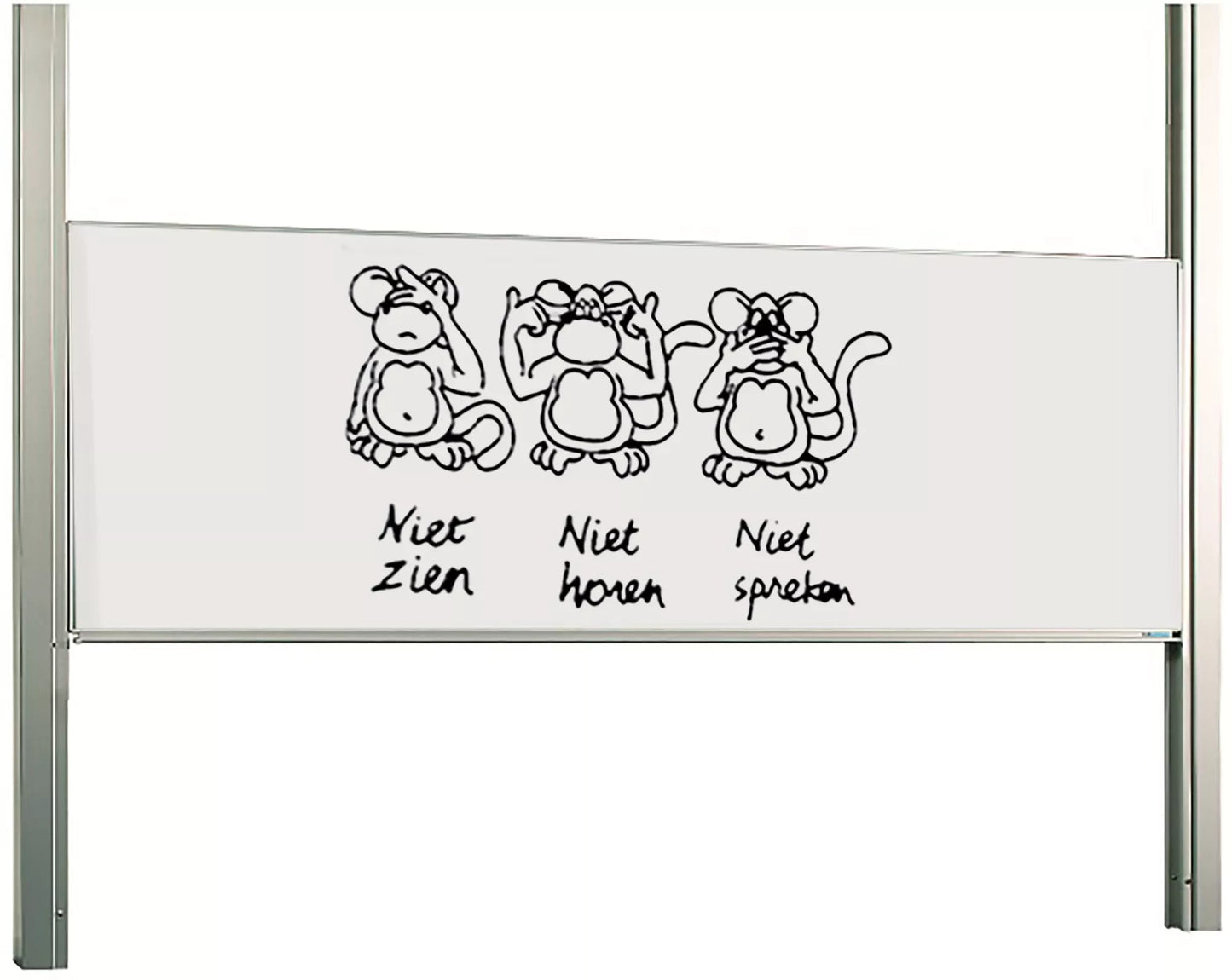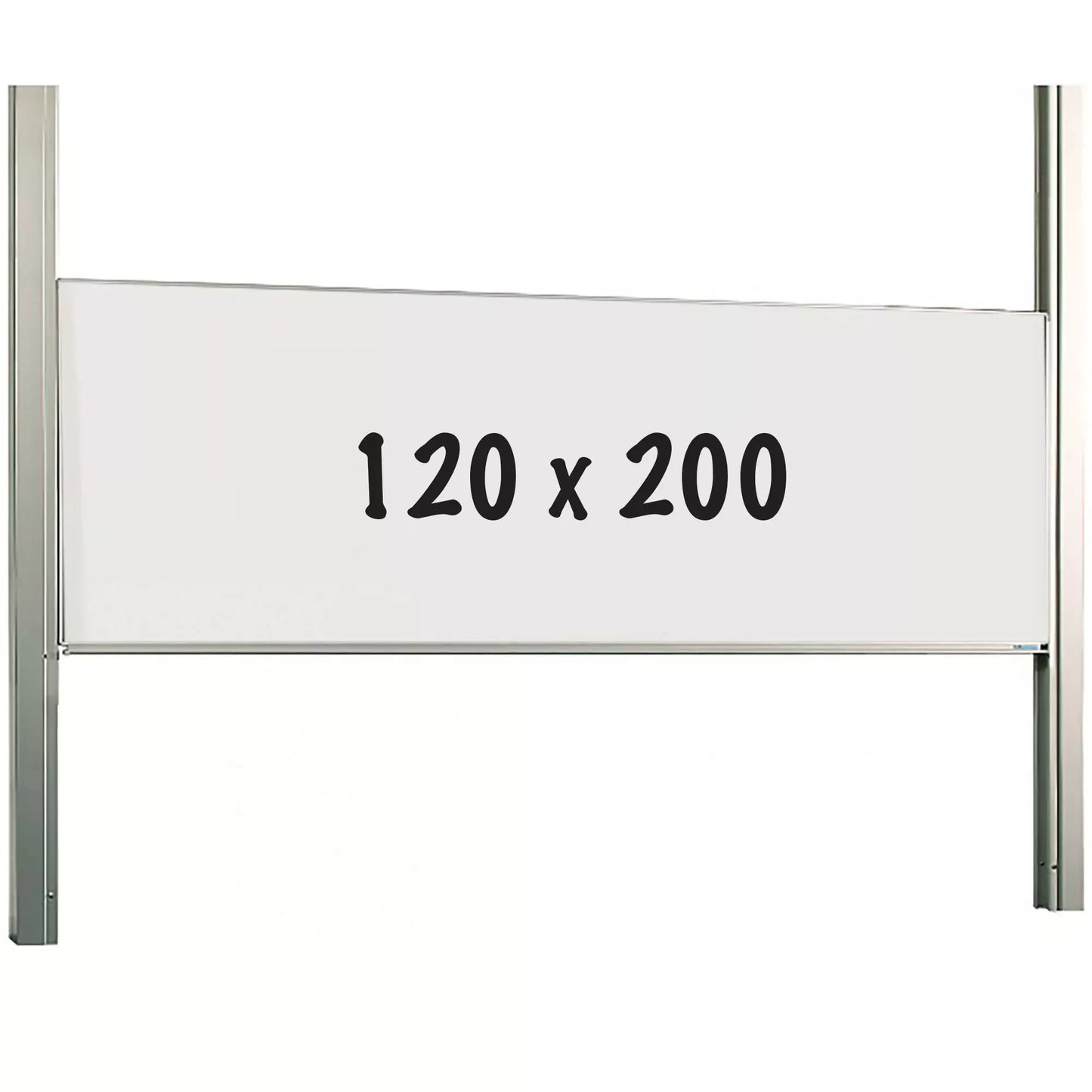 Board with 1 writing surface in enameled steel white (800C) or green. Anodized 19 mm aluminum profile with plastic corner pieces and chalk collection gutter. Mounting between two columns, standard height: 265 cm. Longer columns: optional.