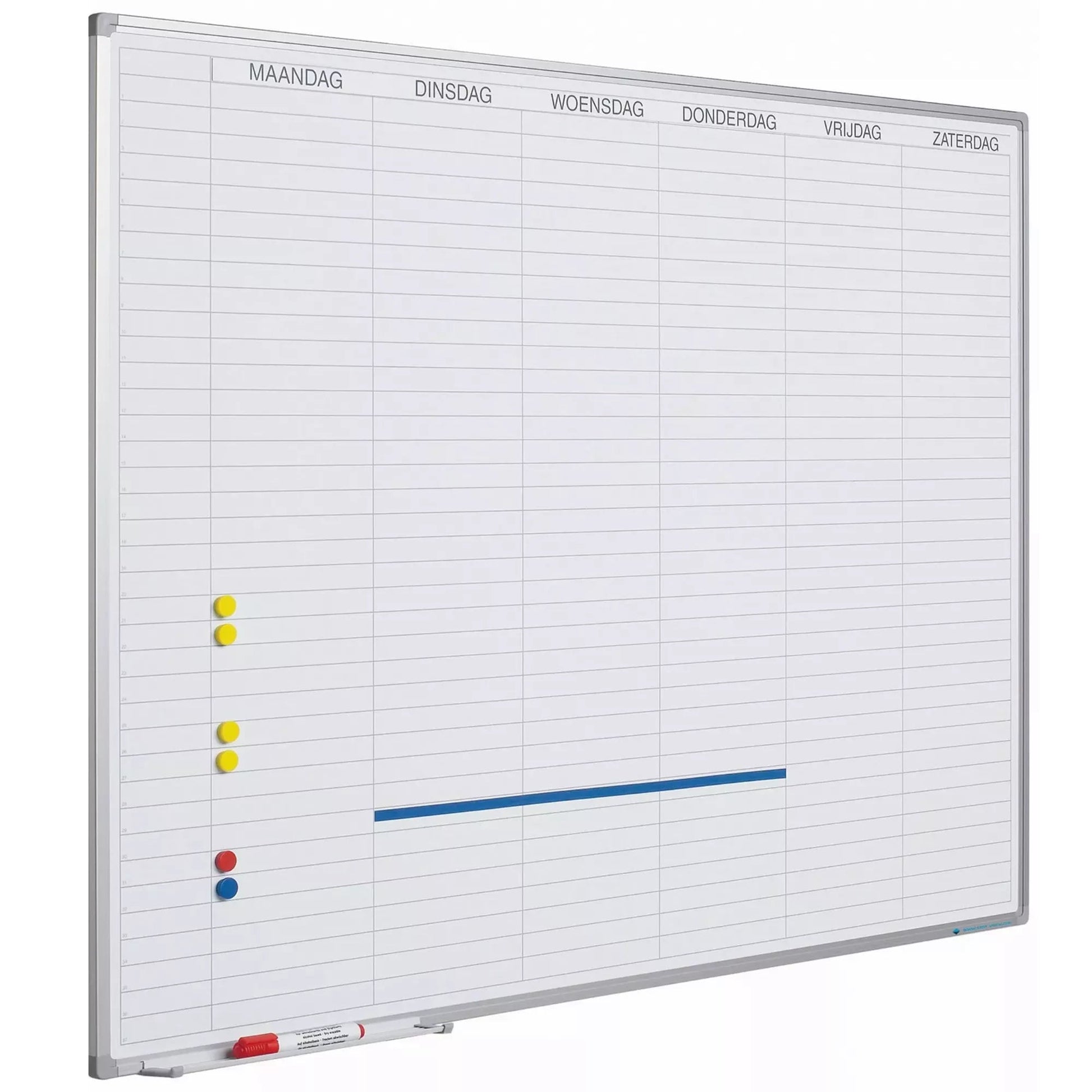 Working day planner with horizontal division from Monday to Saturday with 37 fillable positions under each day. Equipped with anodized aluminum softline profile, including mounting material, marking tray 30 cm and magnetic horizontal day strip.
