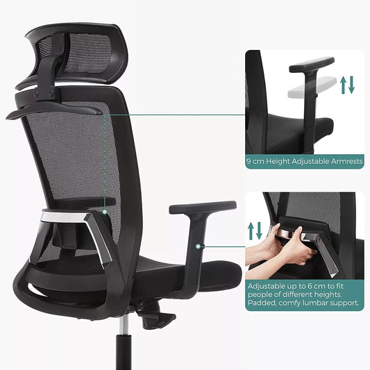 In And OutdoorMatch Bureaustoel Ara - Bureaustoel - Ergonomische Draaistoel - Mesh Bekleding - Verstelbare Hoofdsteun - Hoogte Verstelbaar - Rugleuning, kantelhoek tot 110 - Zwart