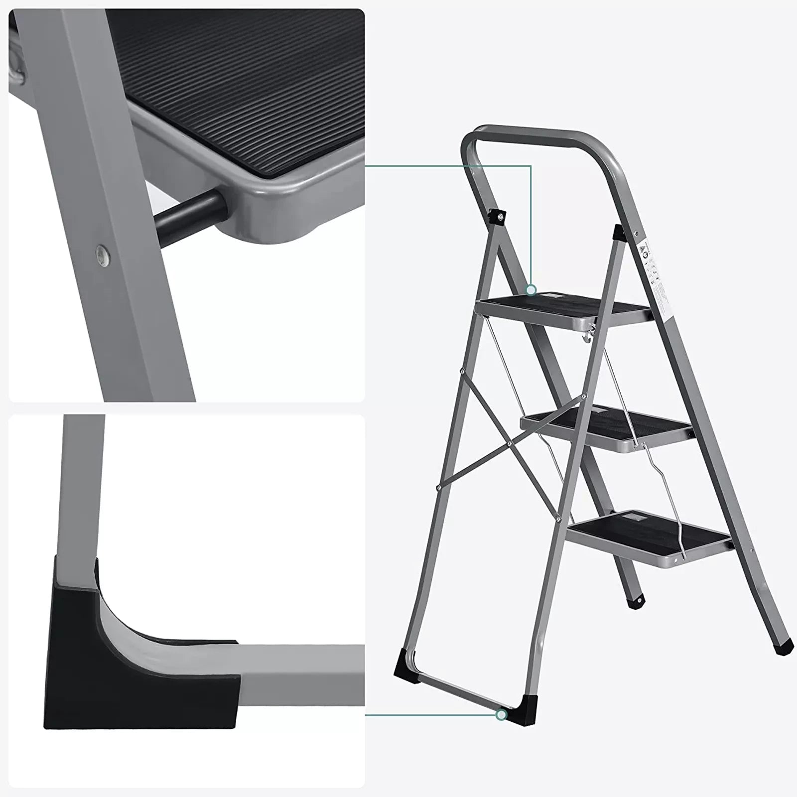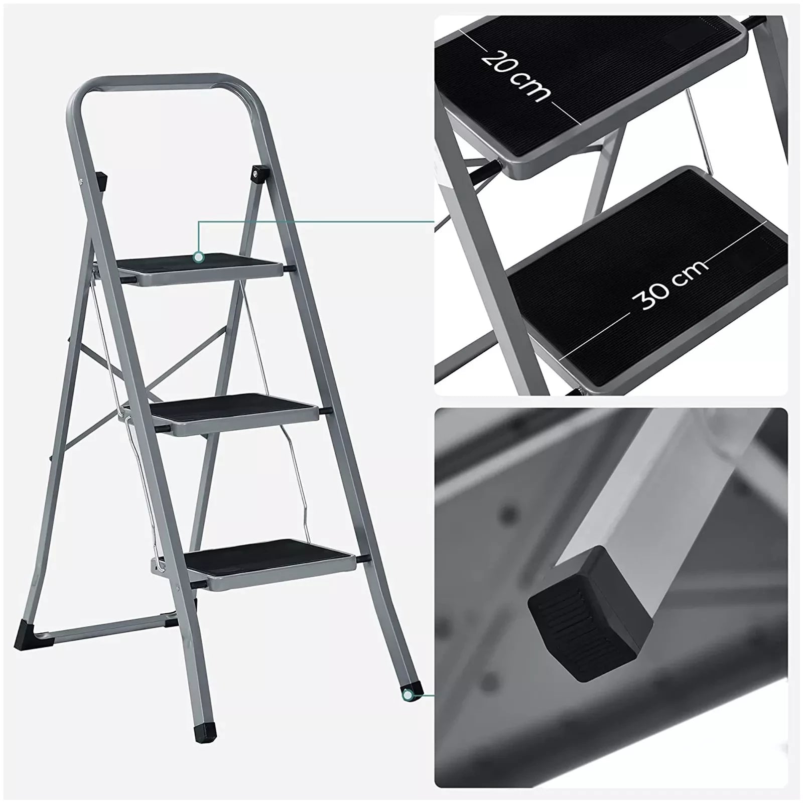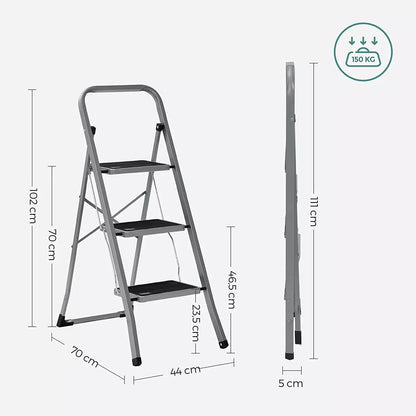 In And OutdoorMatch Opklapbare opstap Garry - met 3 treden - opstapkruk - ladder - 20 cm brede treden - met antislip rubberen matten - met draaggreep - belastbaar tot 150 kg - van staal - grijs/zwart