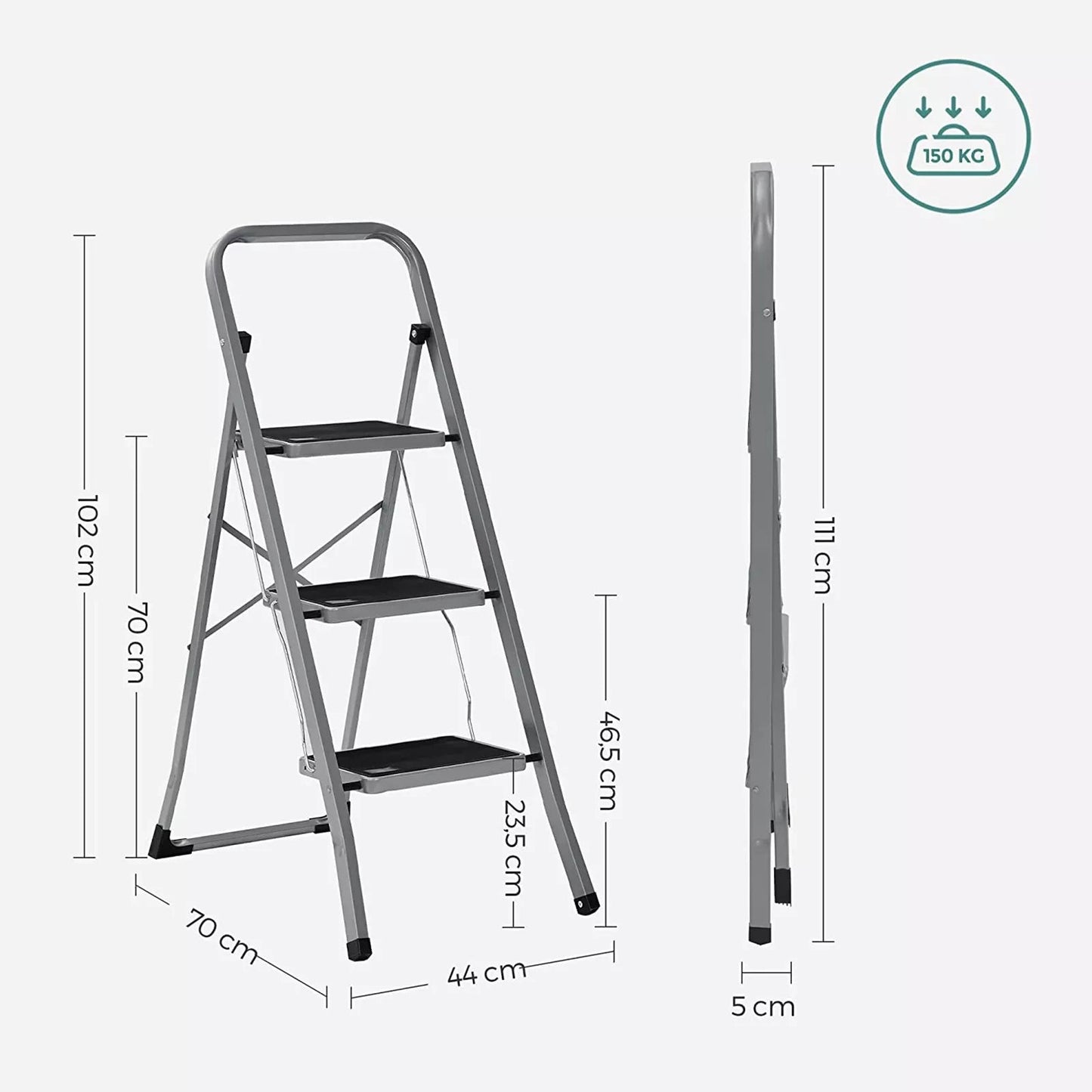 Hoge stabiliteit en veiligheid Een ladder moet u een gevoel van veiligheid geven. Daarom bieden wij u deze stevige trap aan. Hij is gemaakt van hoogwaardig staal en is belastbaar tot 150 kg. Daarnaast zorgen de 20 cm brede treden met antislip rubberen matten en de antislipvoetjes met rubberen coating voor meer stabiliteit. Wilt u nog meer zekerheid? Houd de handige leuning vast! Een veilige werkomgeving houdt je gefocust. Doordacht tot in het kleinste detail. De vouwladder meet ingeklapt slechts 46,5 x 4,5 x 117 cm en past daardoor perfect in een hoek van je garage of in de kofferbak van je auto. Daarnaast weegt hij slechts 5,5 kg en is hij voorzien van een draagbeugel zodat je de ladder gemakkelijk vanuit de kelder naar de tuin vervoert om takken te snoeien. Bovendien heeft de ladder geen scherpe randen en is hij voorzien van afgeronde hoeken en rubberen doppen, wat zorgt voor een veilig gebruik. Productdetails: - Kleur: grijszwart - Materiaal: staal - Afmeting opgevouwen: 46,5 x 4,5 x 117 cm (L x B x H) - Afmeting uitgeklapt: 46,5 x 74,5 x 105 cm (L x B x H) - Maatstappen : 30 x 20 cm - Gewicht: 5,5 kg - Max. statisch draagvermogen: 150 kg Leveringsomvang: - 1 x ladder met 3 treden - 1 x handleiding Inand Outdoormatch Opmerkingen: - Wees voorzichtig bij het inklappen van de ladder om te voorkomen dat uw vingers bekneld raken. - Gebruik het product op een vlakke ondergrond. - Gelieve Gebruik de ladder niet als er olie of water op de grond ligt.- Controleer voordat u de ladder gebruikt of de veiligheidsvoorziening automatisch is vergrendeld.