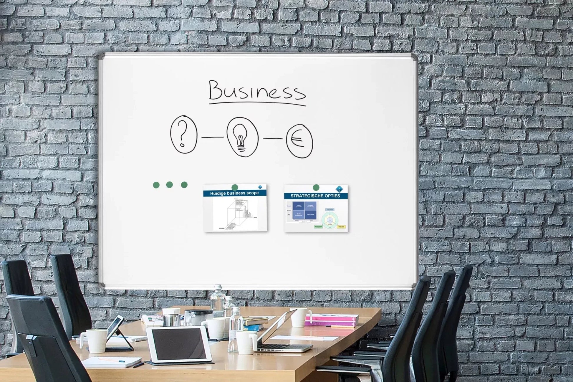 Hoogwaardig whiteboard van wit geëmailleerd staal (800C). Whiteboard voor zeer intensief en duurzaam gebruik. Geanodiseerd aluminium designprofiel met kunststof grijze hoeken. Inclusief ophangmateriaal en stiftbakje van 30 cm.