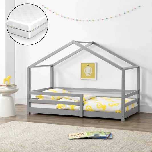 In And OutdoorMatch Kinderbed Toni - Grenen - Huisbed - Met matras en valbescherming - 70x140 cm - Lichtgrijs - Voor meisjes - Voor jongens - Voor kinderen
