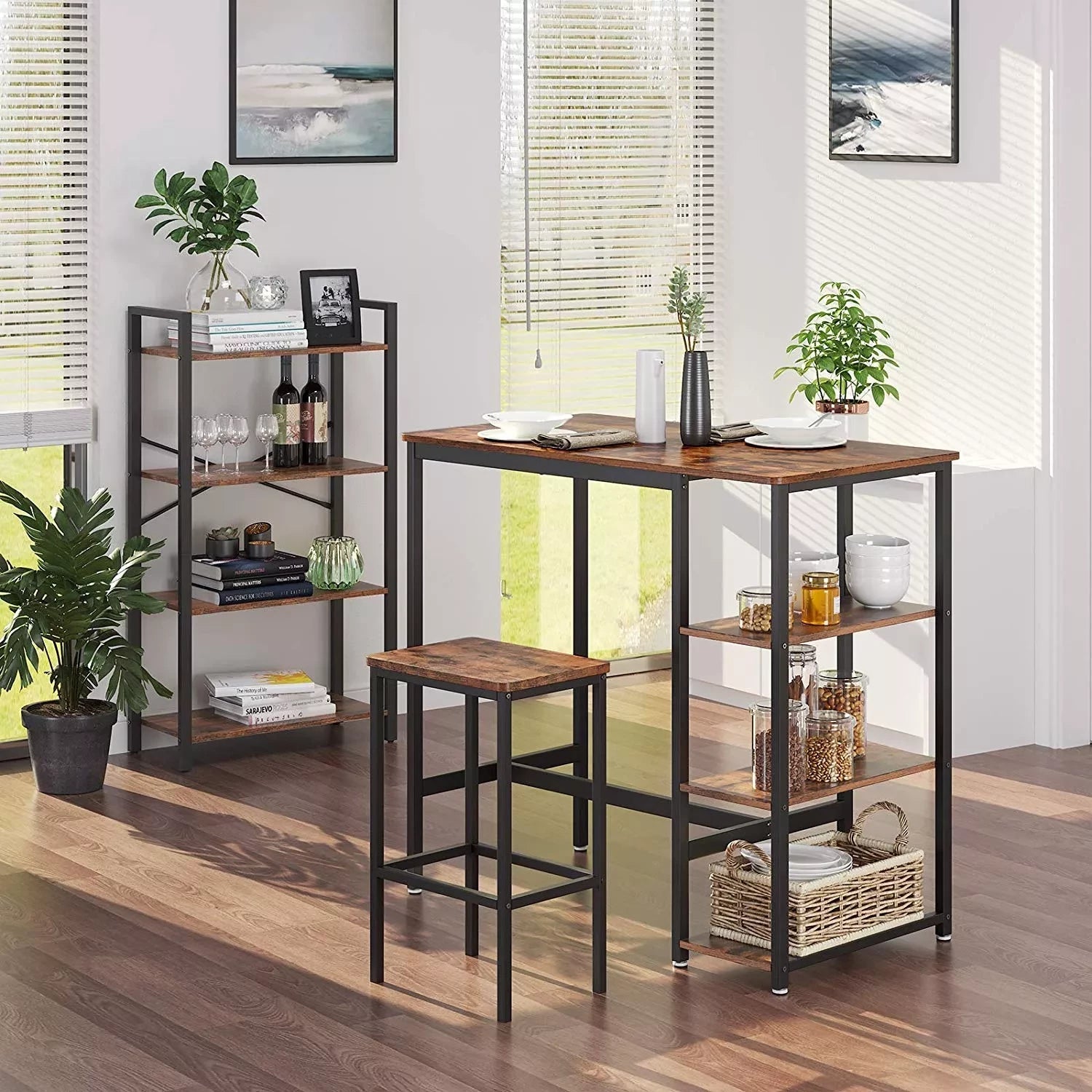 GOEDE APPETIT: Zet salade, pasta en andere gerechten op het 109 x 60 cm grote tafelblad van deze bartafel, bekijk een film op je laptop en geniet van een heerlijk diner. UITERST SMAKELIJKE UITSTRALING: De 3 houtvezelplanken van deze hoge tafel geven uw eethoek een industrieel design. Eet heerlijke lekkernijen in een stijlvolle sfeer! BINNEN EEN PAAR MINUTEN: Dankzij de eenvoudig te volgen instructies en de genummerde onderdelen heeft u deze bartafel in een mum van tijd aan de praat. Pak 2 barstoelen en maak de set compleet. AFMETINGEN: 109 x 60 x 100 cm