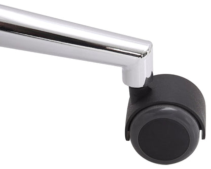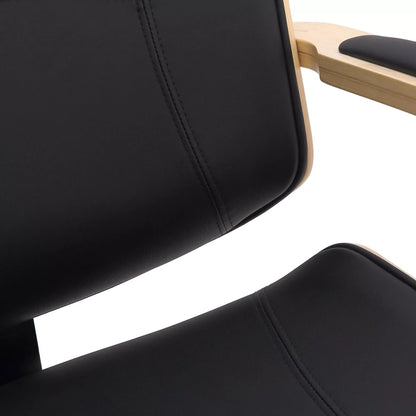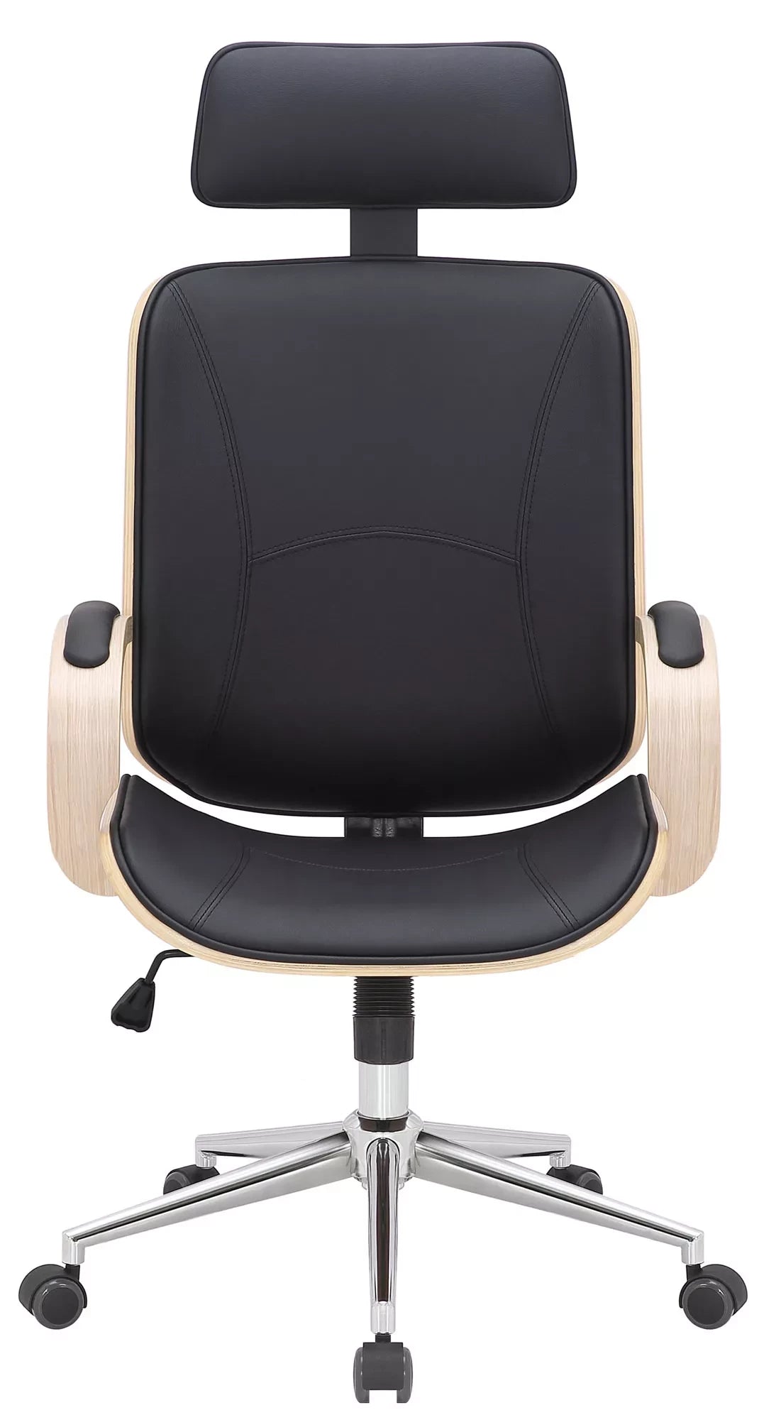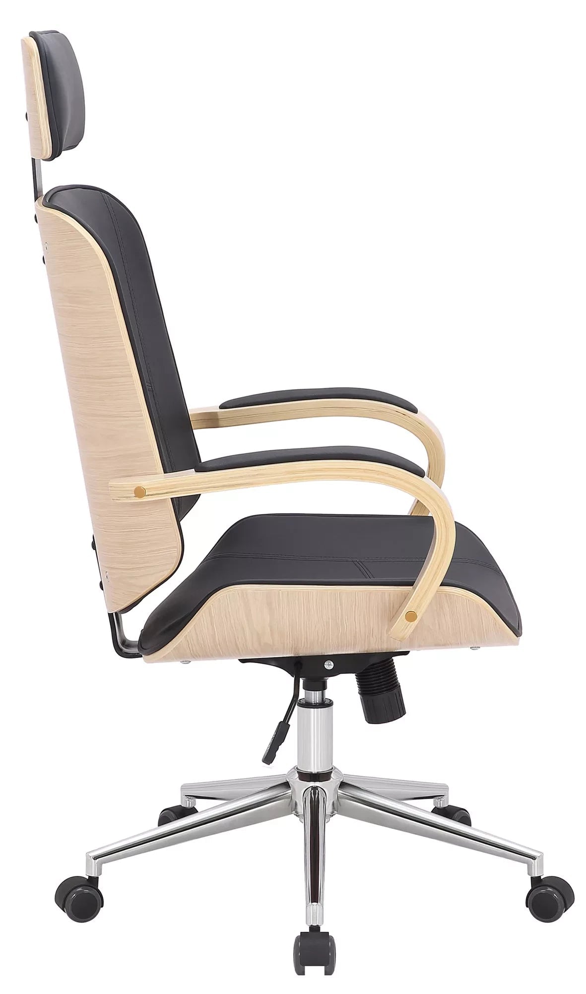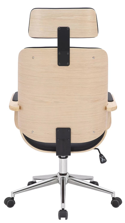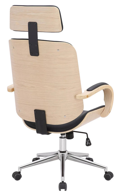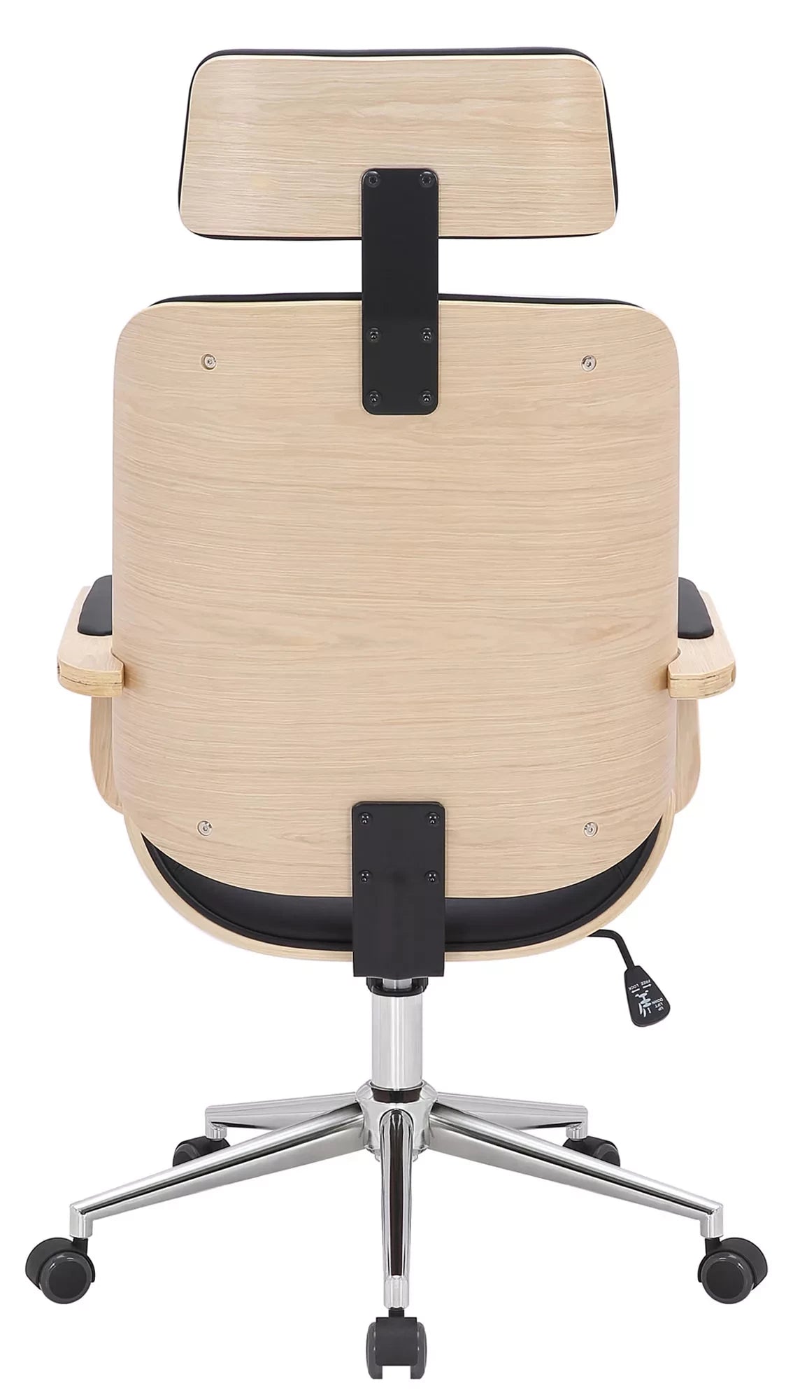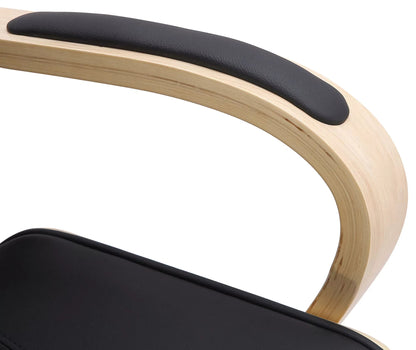 De Thaddeus directiestoel is een stijlvolle bureaustoel met een zeer hoogwaardige bekleding met kunstleren bekleding. Kunstleren hoezen hebben als voordeel dat ze elastisch zijn en weer rechttrekken als de belasting wordt weggenomen. Dit ziet er niet alleen mooier uit, maar verlengt ook de levensduur van de stoelhoes. Het gebogen houten frame maakt deze bureaustoel tot een absolute blikvanger en geeft hem een elegant design. Dankzij de traploos verstelbare zithoogte is ergonomisch zitten gegarandeerd en het ingebouwde schommelmechanisme zorgt voor meer bewegingsvrijheid. Het frame is gemaakt van metaal met chroomlook en is zeer stabiel. De bureaustoel staat veilig op vijf soepel lopende wielen. Of het nu harde vloeren of tapijten zijn, je rolt altijd gemakkelijk en losjes over de vloer.