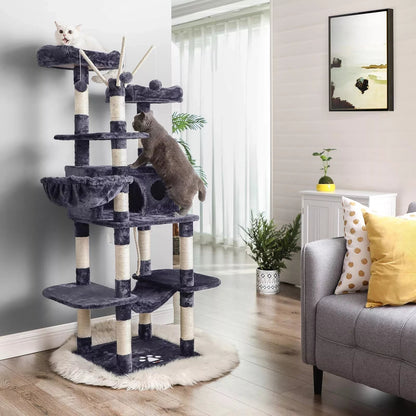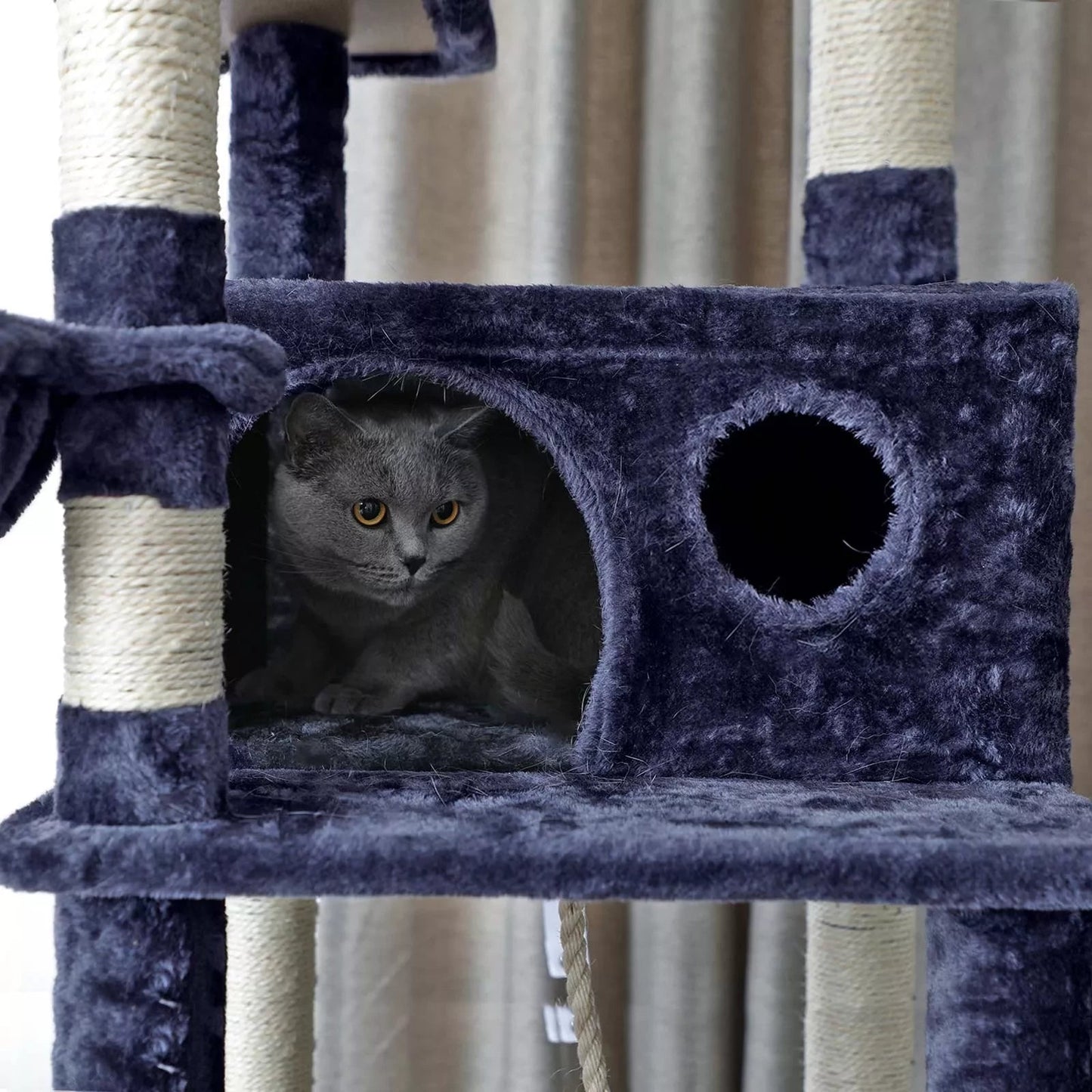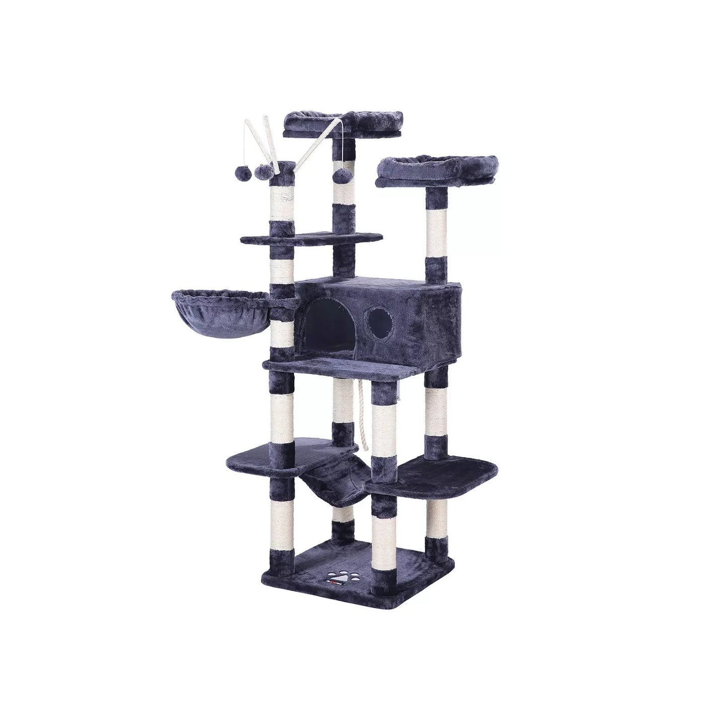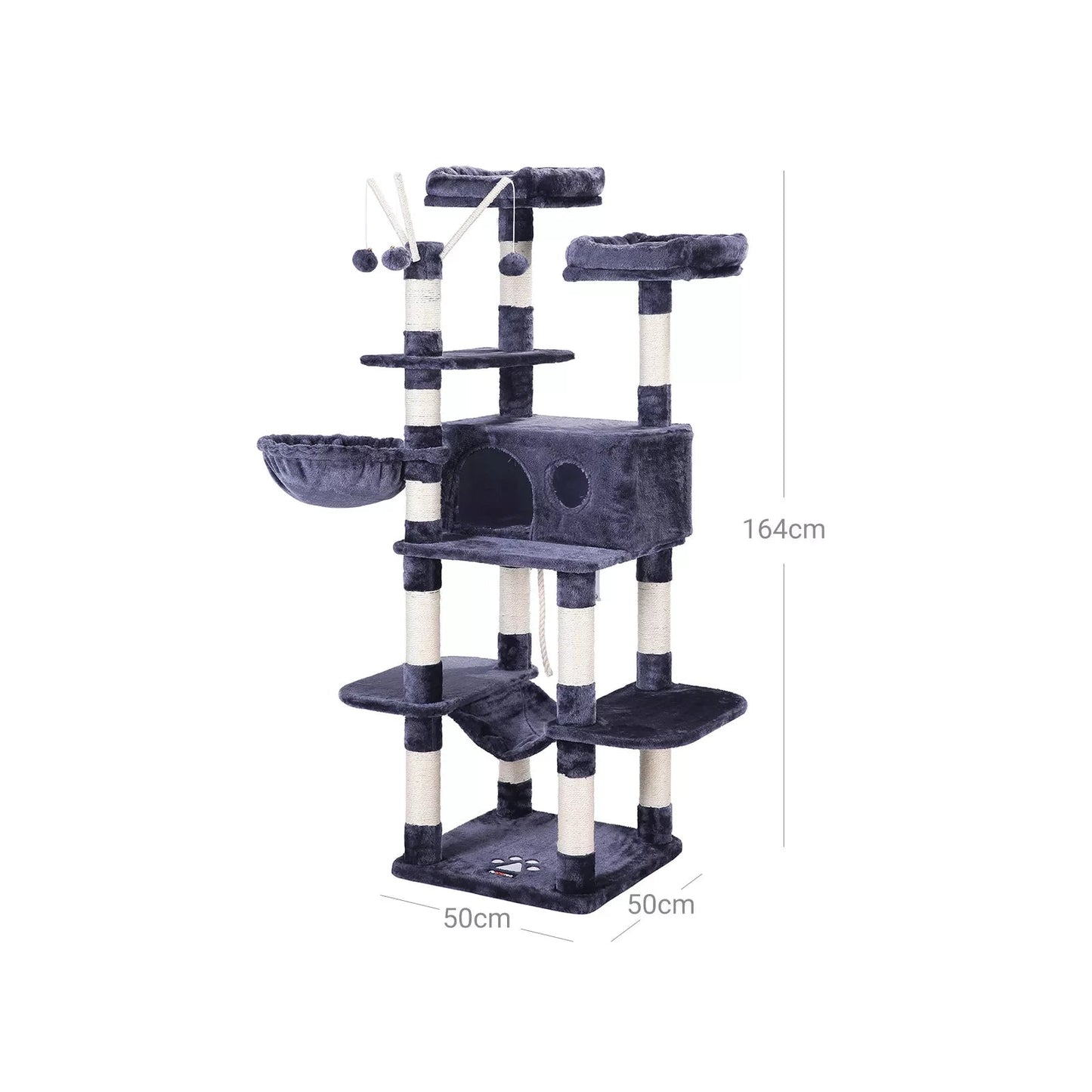 In de creatieve workshops van InAndOutdoorMatch springen twee schattige katjes rond, onderzoeken alle krabpalen persoonlijk en geven hun dier er feedback op. Zo ontdekken de ontwerpers van InAndOutdoorMatch uit de eerste hand of uit de eerste hand of de producten voldoen aan de eisen van verwende snorhaardragers. De highlights van deze krabpaal op een rij: - behoorlijk groot; biedt plaats aan 2 katten, die elk niet meer dan 7 kg wegen - 2 goed gevoerde kijkplatforms met opstaande randen om te ontspannen - Comfortabel nestje om verstoppertje te spelen en te ontspannen - Stevige ligstoel en hangmat om in te dutten - Met hout versterkte basis en anti-tip voor meer stabiliteit en veiligheid - 3 afneembare stokken met haarballen en een speeltouw voor meer speelplezier - Hoes van slijtvast, zacht pluche Productdetails: - Kleur: rookgrijs - Materiaal: spaanplaat, pluche, sisal - Afmeting: 50 x 50 x 164 cm (L x B x H) - Gewicht: 18 kg Leveringsomvang: - 1 x krabpaal - 1 x kantelbeveiliging - 1 x installatieaccessoires - 1 x handleiding (DE, EN, FR, ES, IT ) InAndOutdoorMatch Opmerkingen: - Als de knuffelgrot of de afdekking beschadigd zou zijn, neem dan onmiddellijk contact op met onze klantenservice voor vervanging of een andere oplossing om letsel door kapotte onderdelen te voorkomen. - Verwijder de vachtkussens onmiddellijk als uw kat erop kauwt.
