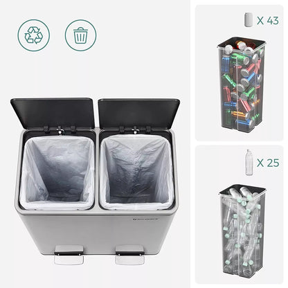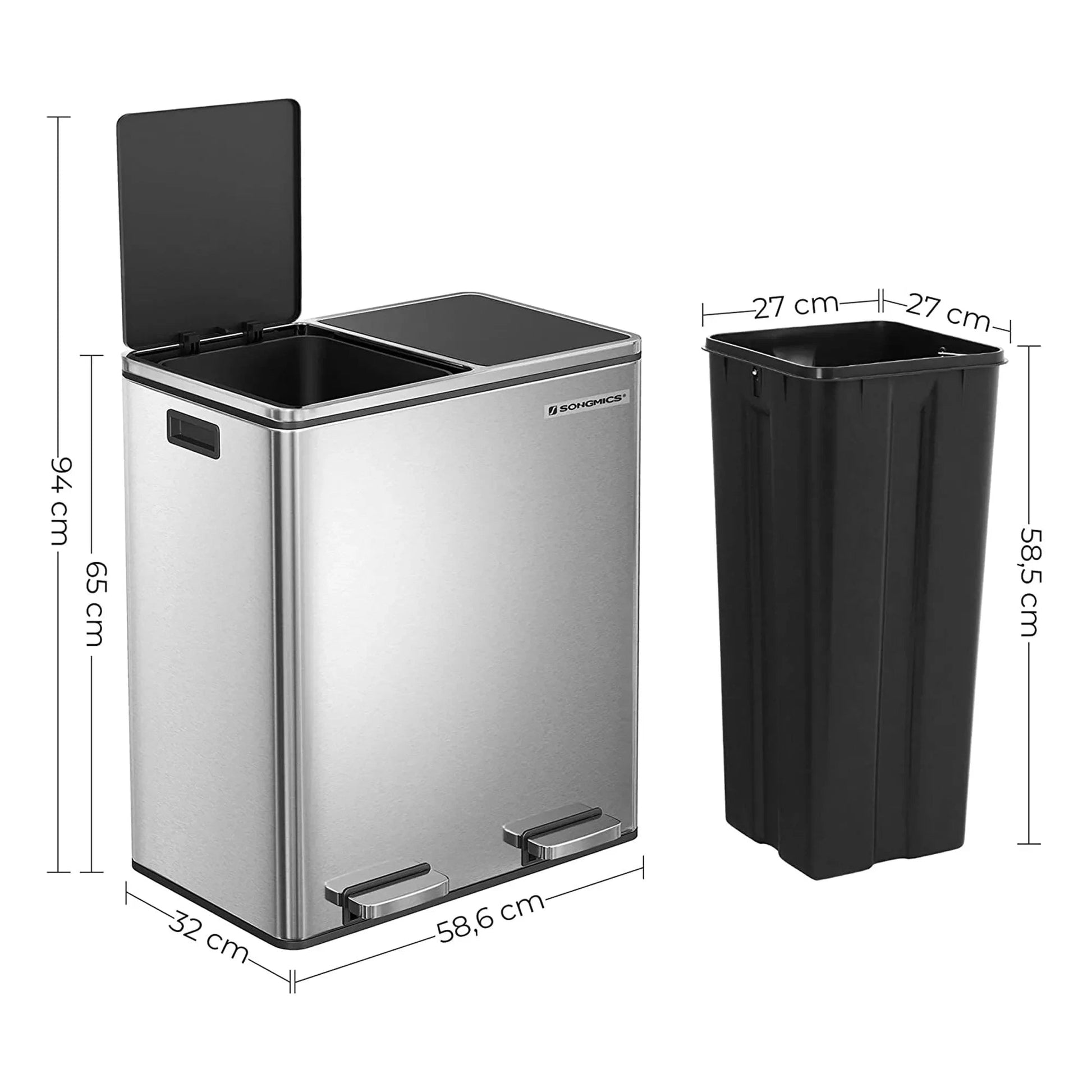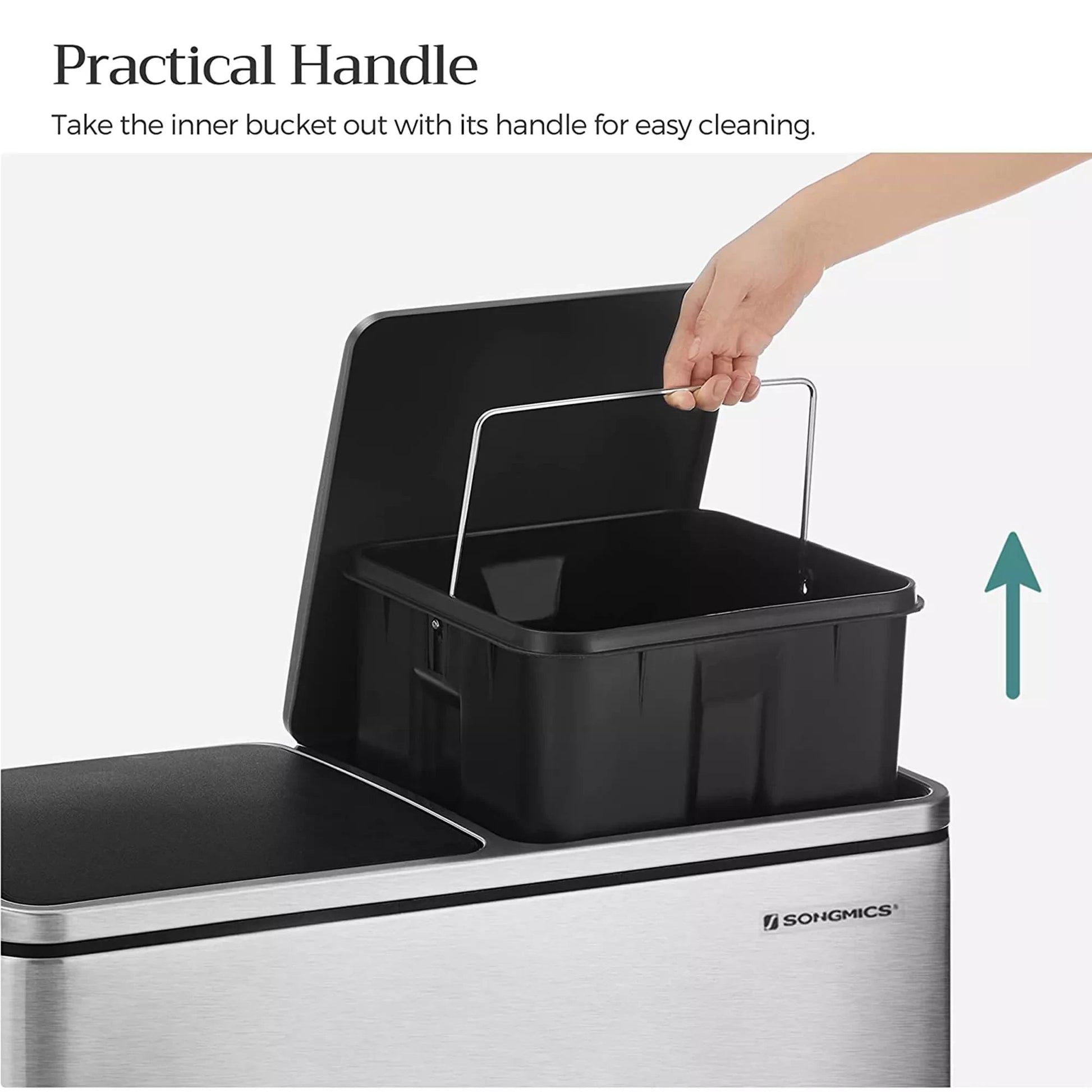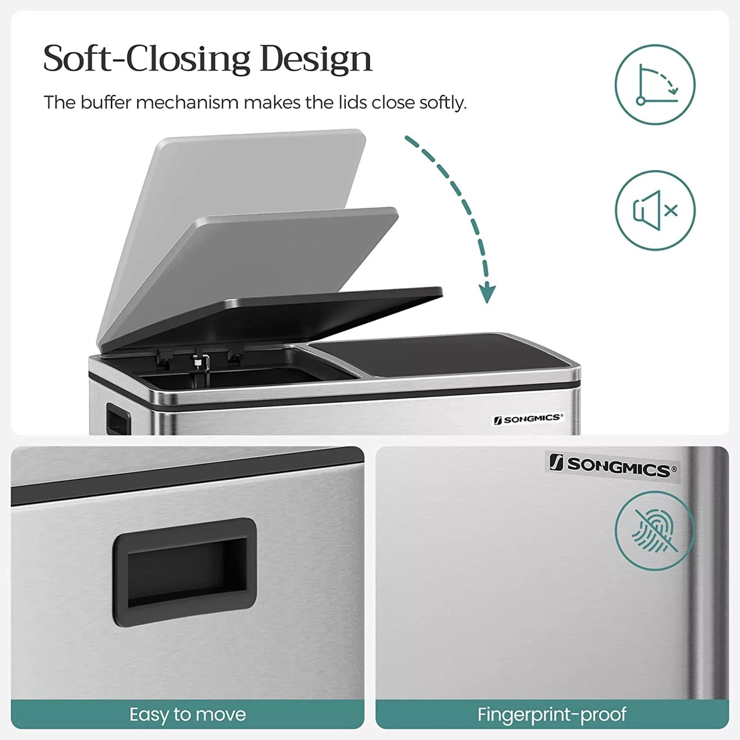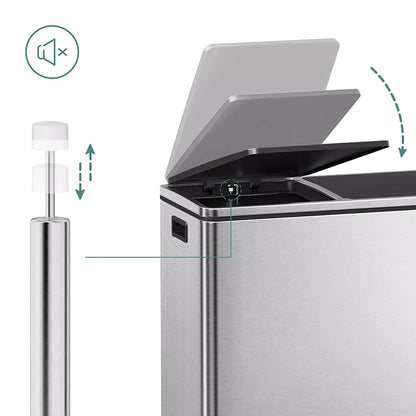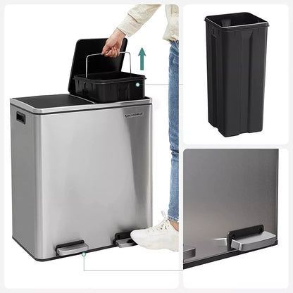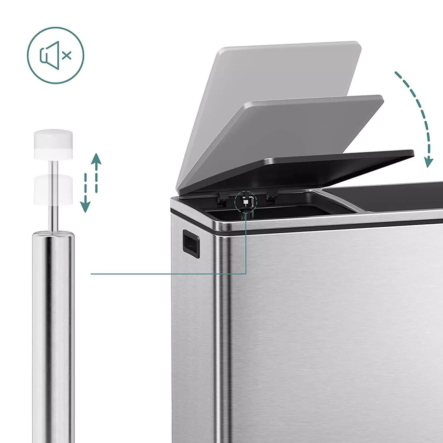ONTWERP: Met 2 aparte compartimenten en een strak uiterlijk kan de afvalbak van 60 liter uw afval en recyclebare materialen netjes sorteren in één handige, ruimtebesparende bak. EIGENSCHAPPEN: Met het voetpedaal kan de bak handsfree worden geopend, het ABS-kunststof deksel sluit langzaam, stil en luchtdicht en houdt bacteriën op afstand. RUIMTEBESPARING: Met 2 voetpedalen en deksels kunt u de prullenbak gebruiken zonder de prullenbak te openen. Door de rechthoekige vorm kun je de bak direct tegen de muur plaatsen, uit de weg. GEBRUIKSVRIENDELIJK: Roestvrij staal met matte afwerking, vingerafdrukbestendige zijhandgrepen voor gemakkelijke mobiliteit, verwijderbare plastic emmers voor gemakkelijke verwijdering van het afval.