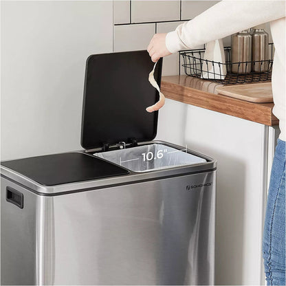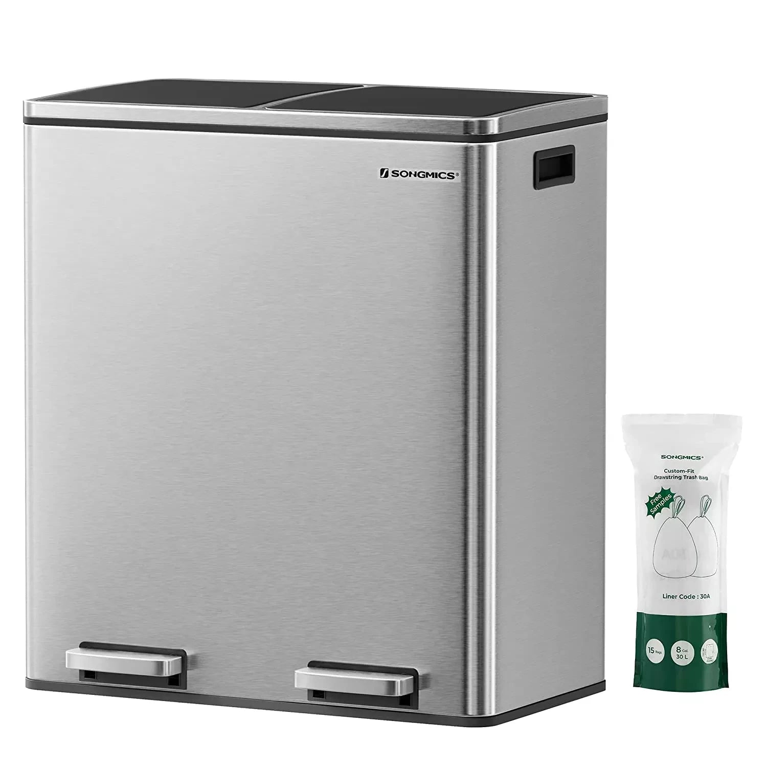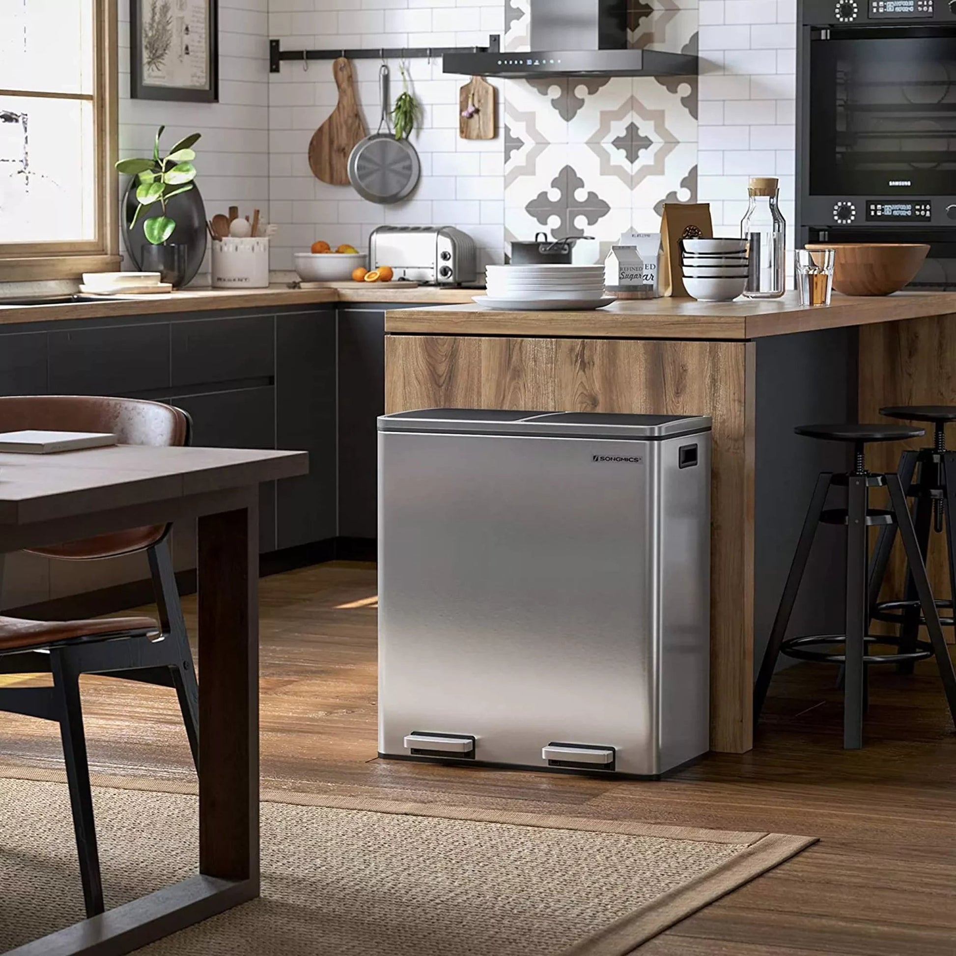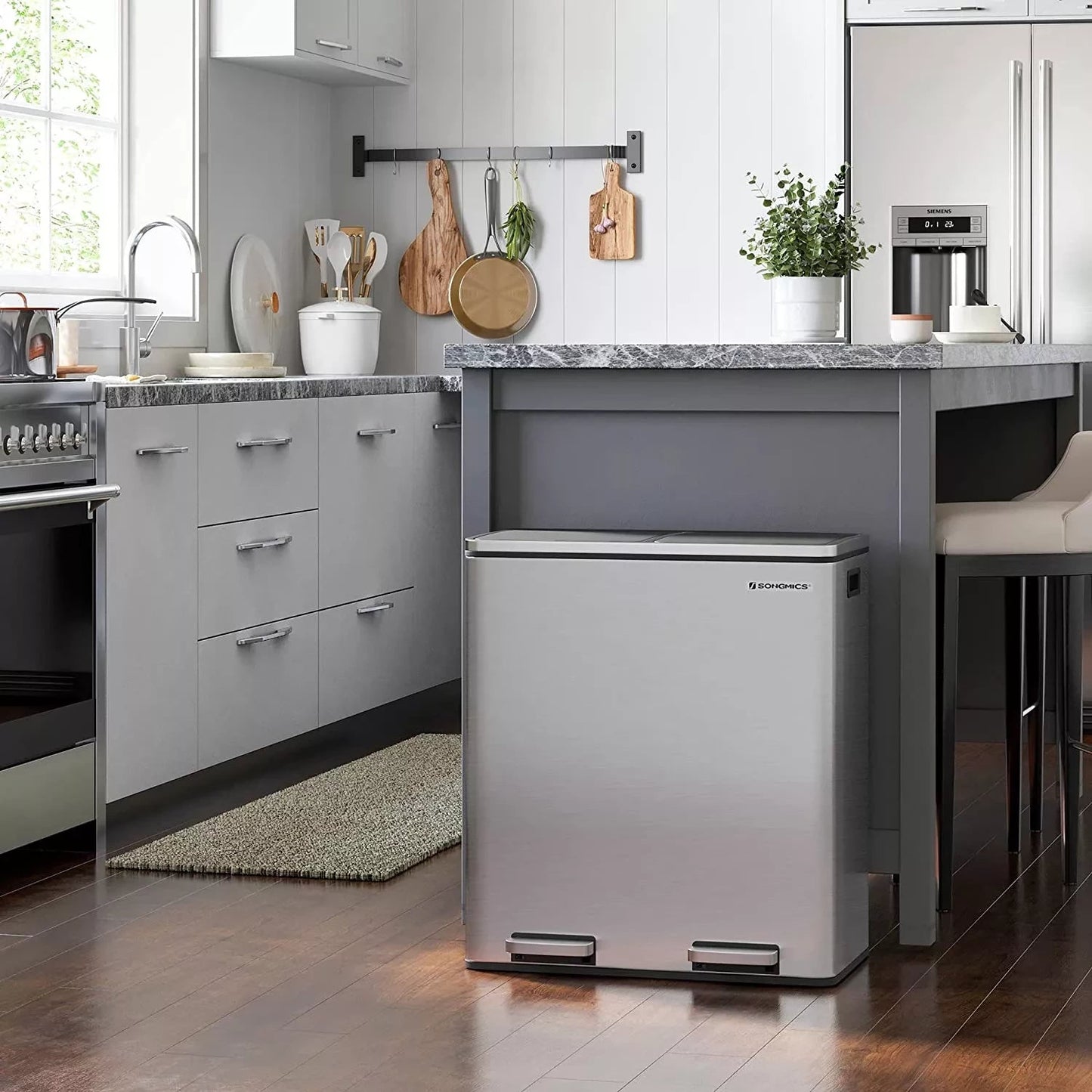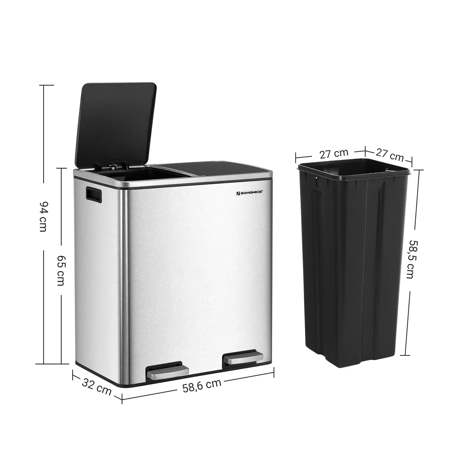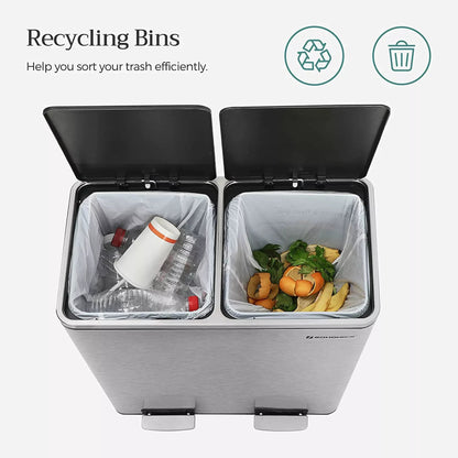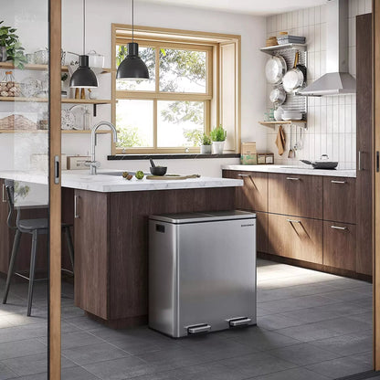 ONTWERP: Met 2 aparte compartimenten en een strak uiterlijk kan de afvalbak van 60 liter uw afval en recyclebare materialen netjes sorteren in één handige, ruimtebesparende bak. EIGENSCHAPPEN: Met het voetpedaal kan de bak handsfree worden geopend, het ABS-kunststof deksel sluit langzaam, stil en luchtdicht en houdt bacteriën op afstand. RUIMTEBESPARING: Met 2 voetpedalen en deksels kunt u de prullenbak gebruiken zonder de prullenbak te openen. Door de rechthoekige vorm kun je de bak direct tegen de muur plaatsen, uit de weg. GEBRUIKSVRIENDELIJK: Roestvrij staal met matte afwerking, vingerafdrukbestendige zijhandgrepen voor gemakkelijke mobiliteit, verwijderbare plastic emmers voor gemakkelijke verwijdering van het afval.